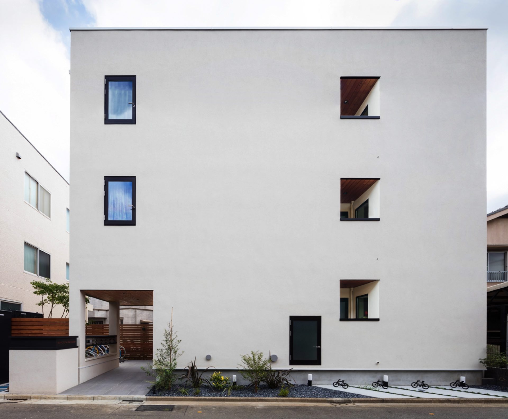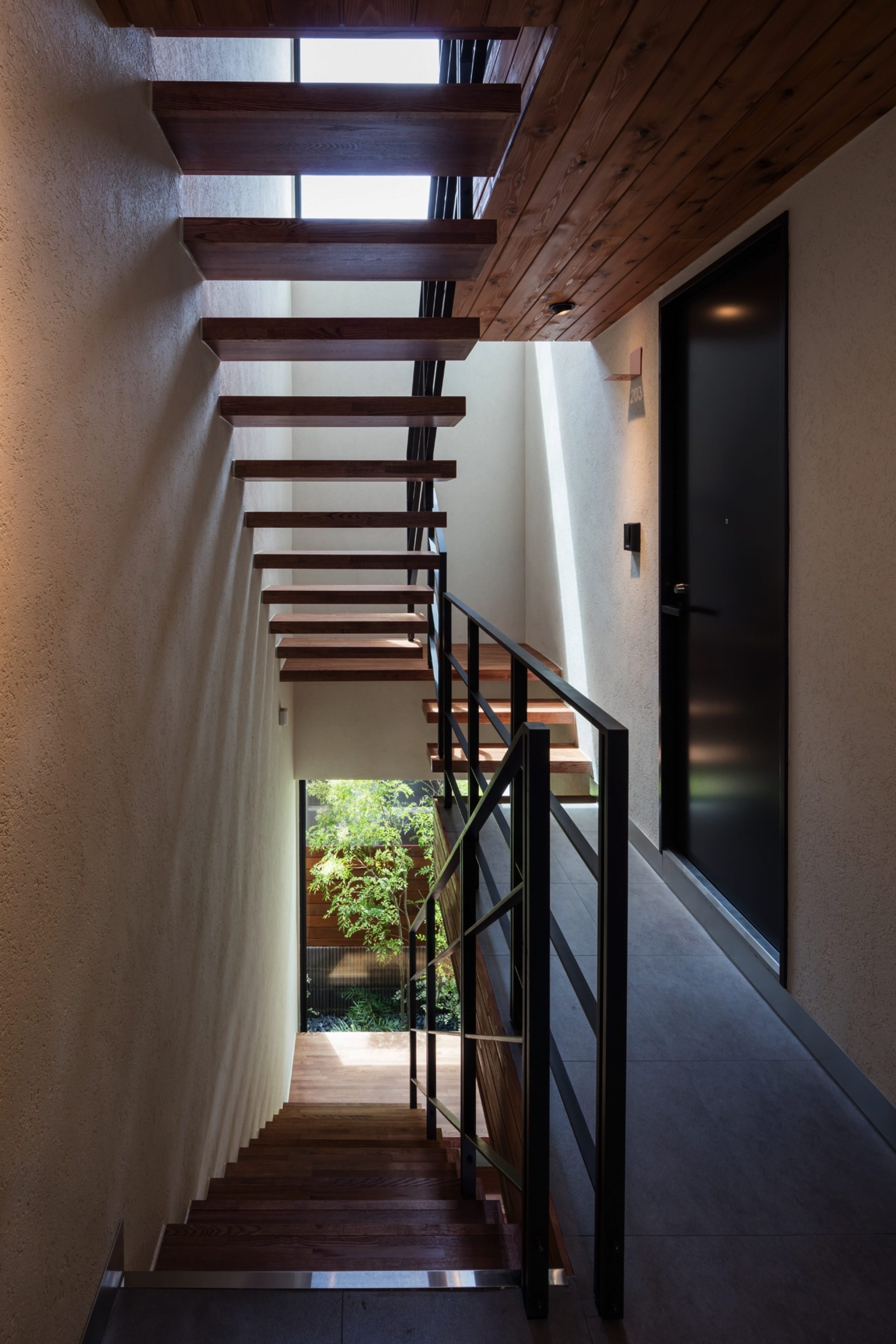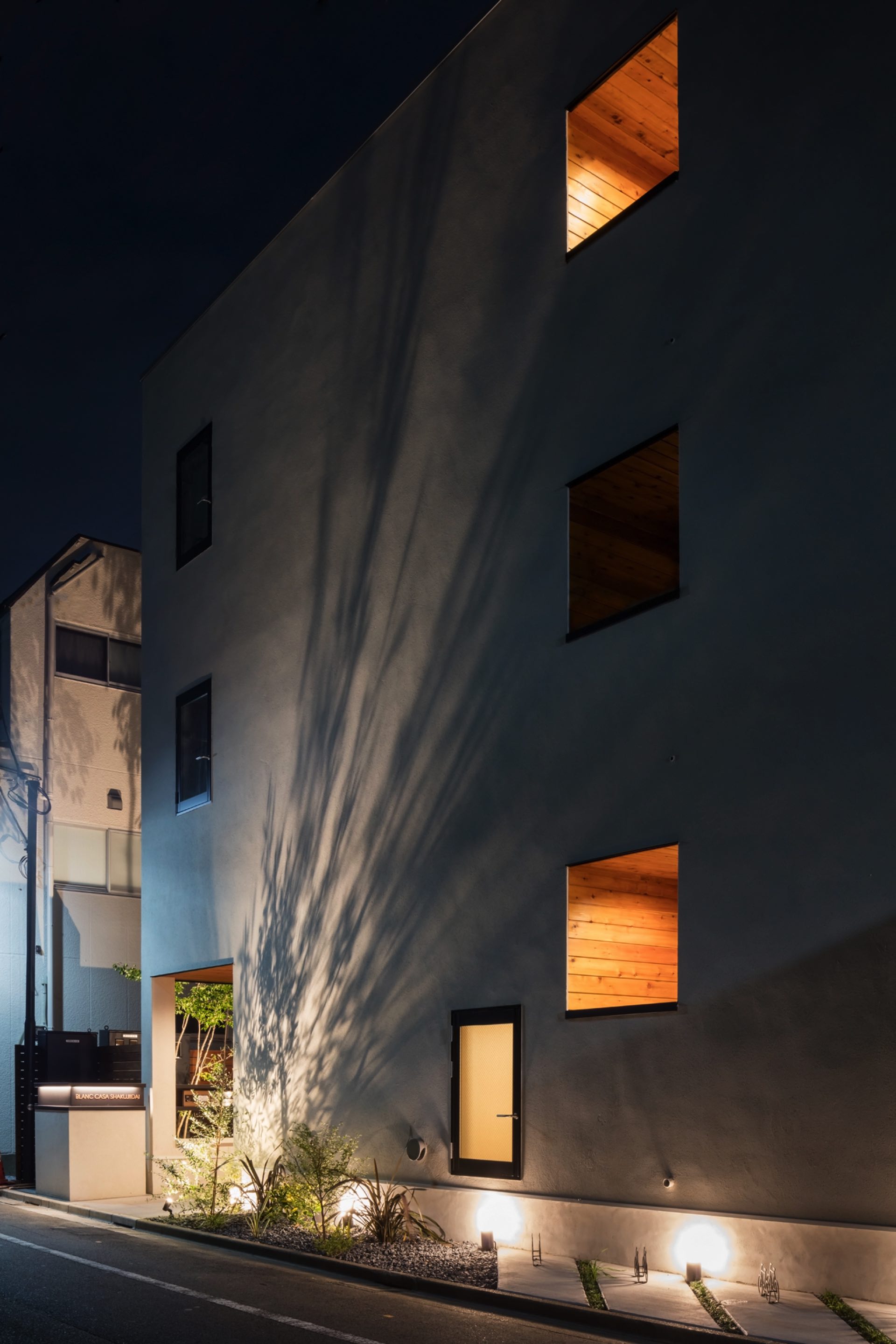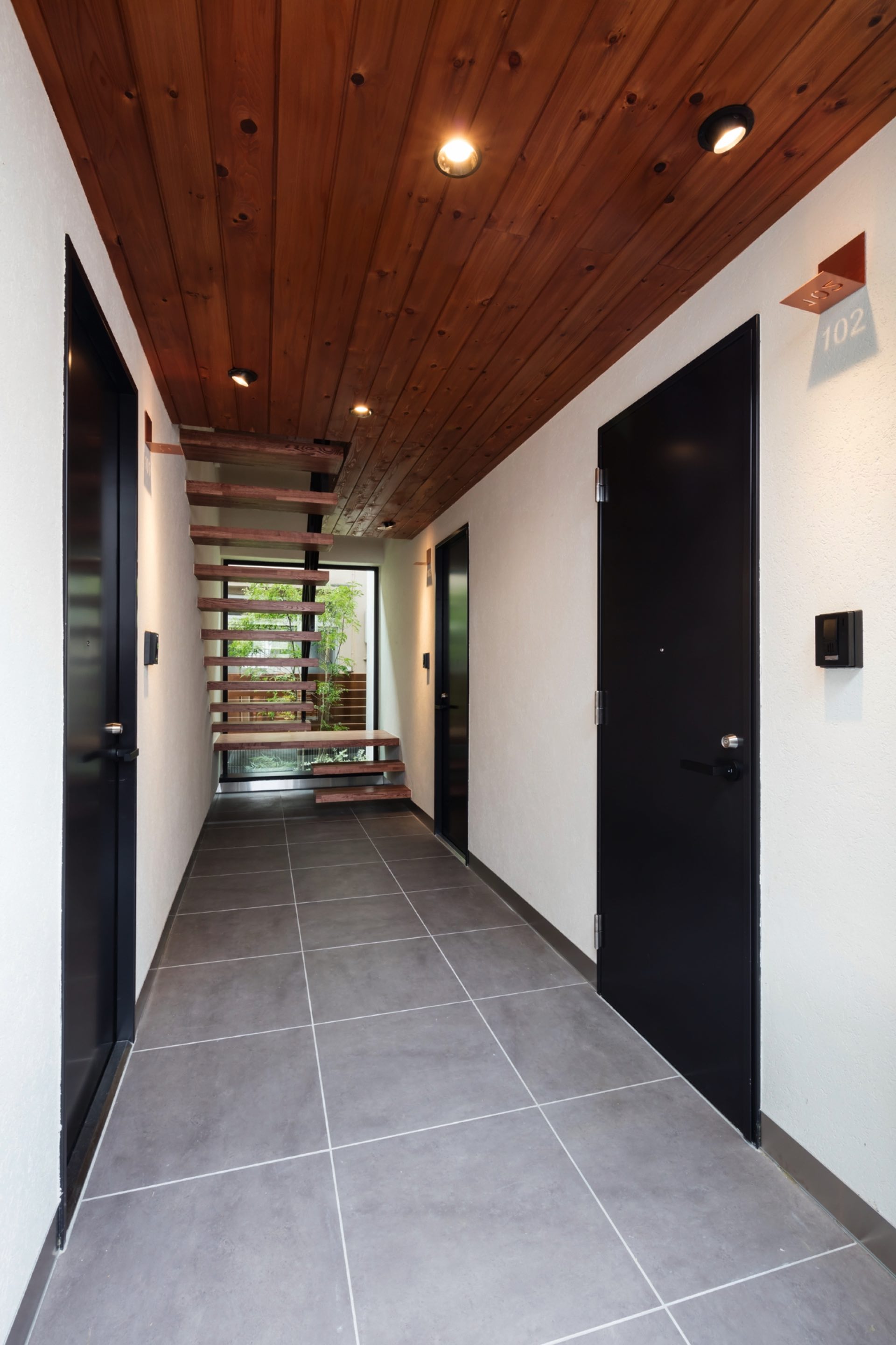 石神井台7丁目の集合住宅 第1種中高層住居専用地域 構造:木造 敷地面積:206.52㎡ 建築面積:123.84㎡ 延床面積:355.26㎡ 住戸数 :9戸 1階ホールは片持ち階段越しに中庭のツリーに目線が抜ける様に演出。エントランスを奥へ引込む事により、ピロティからエントランスへの豊かな動線を構成。内部空間は可動収納や可動間仕切りを使うことにより、大きく部屋を使いたい場合はワンルームへと可変性をもった居室を実現。