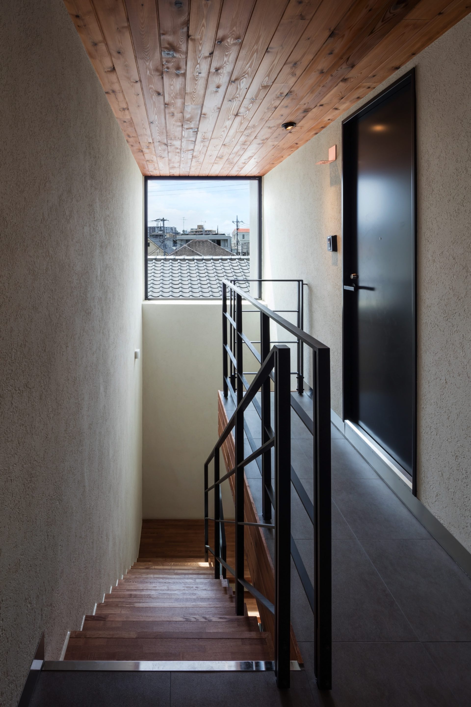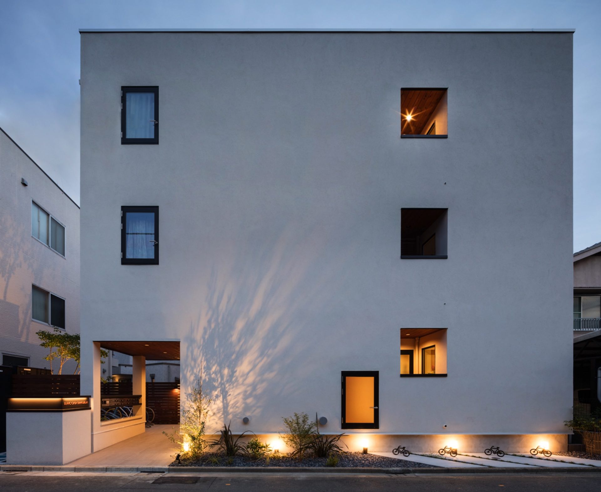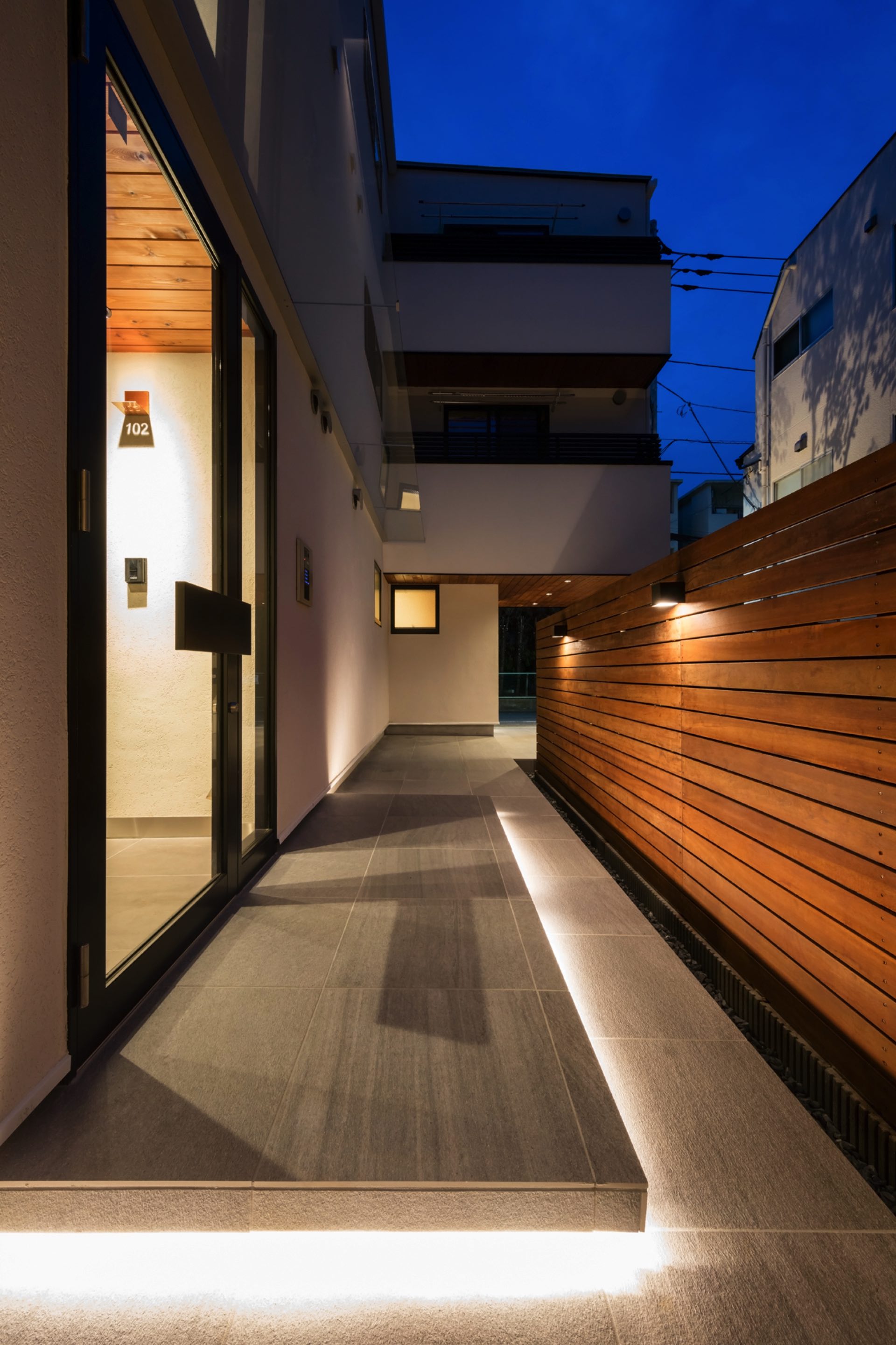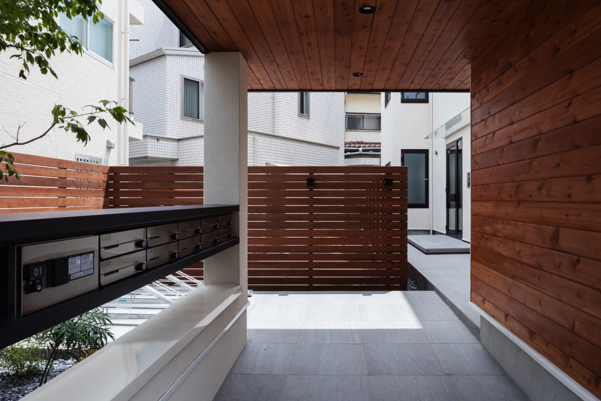 石神井台7丁目の集合住宅 第1種中高層住居専用地域 構造:木造 敷地面積:206.52㎡ 建築面積:123.84㎡ 延床面積:355.26㎡ 住戸数 :9戸 1階ホールは片持ち階段越しに中庭のツリーに目線が抜ける様に演出。エントランスを奥へ引込む事により、ピロティからエントランスへの豊かな動線を構成。内部空間は可動収納や可動間仕切りを使うことにより、大きく部屋を使いたい場合はワンルームへと可変性をもった居室を実現。
