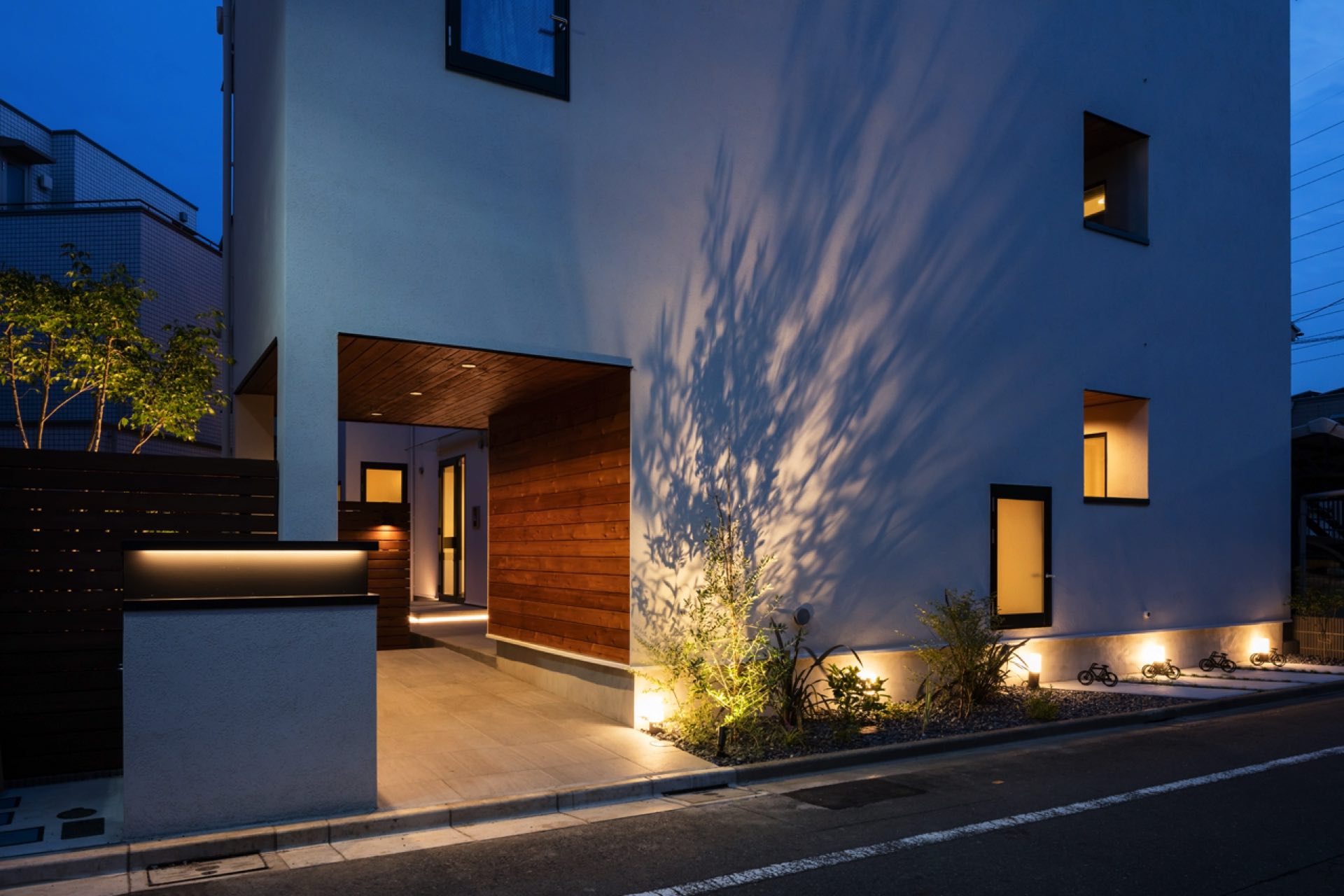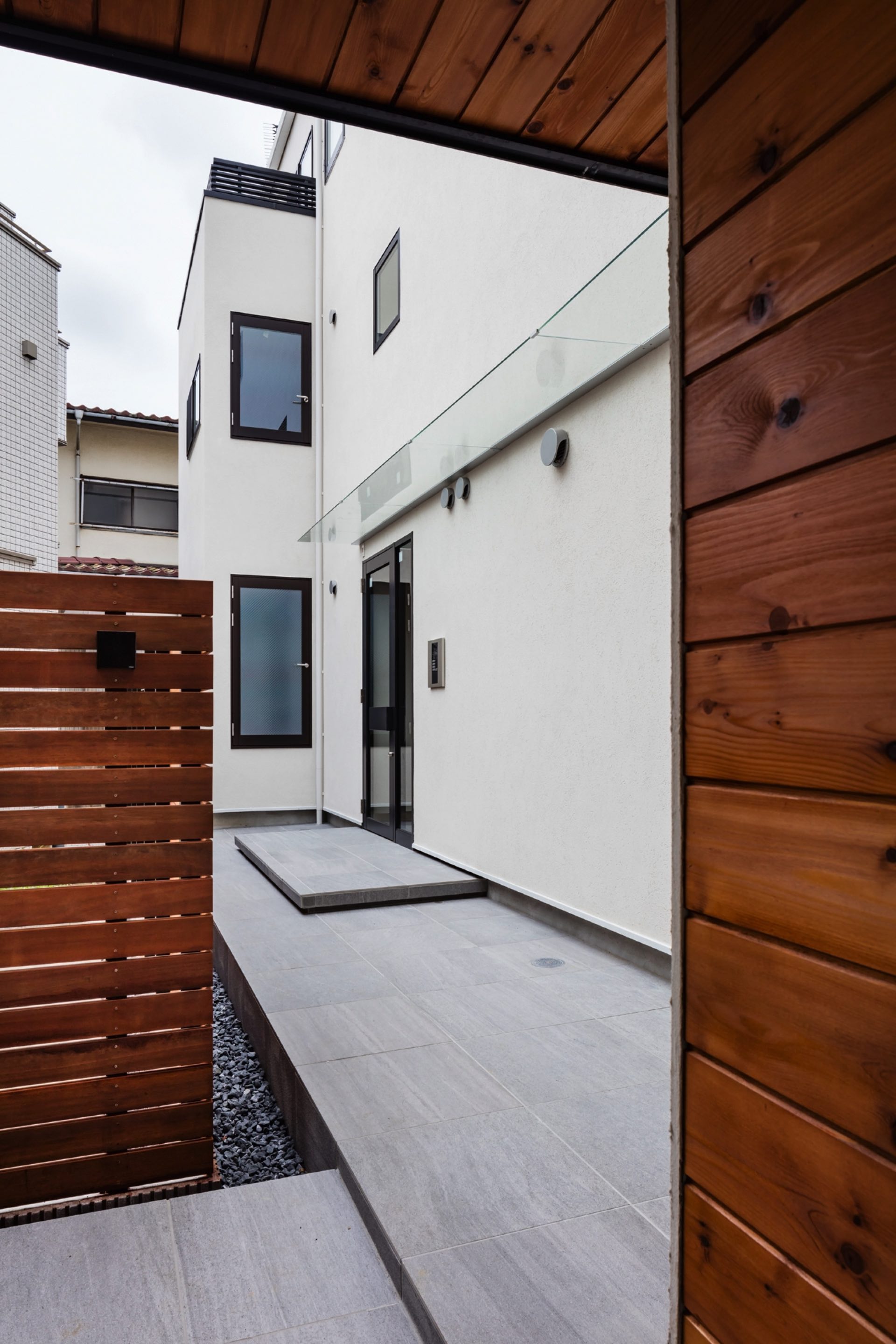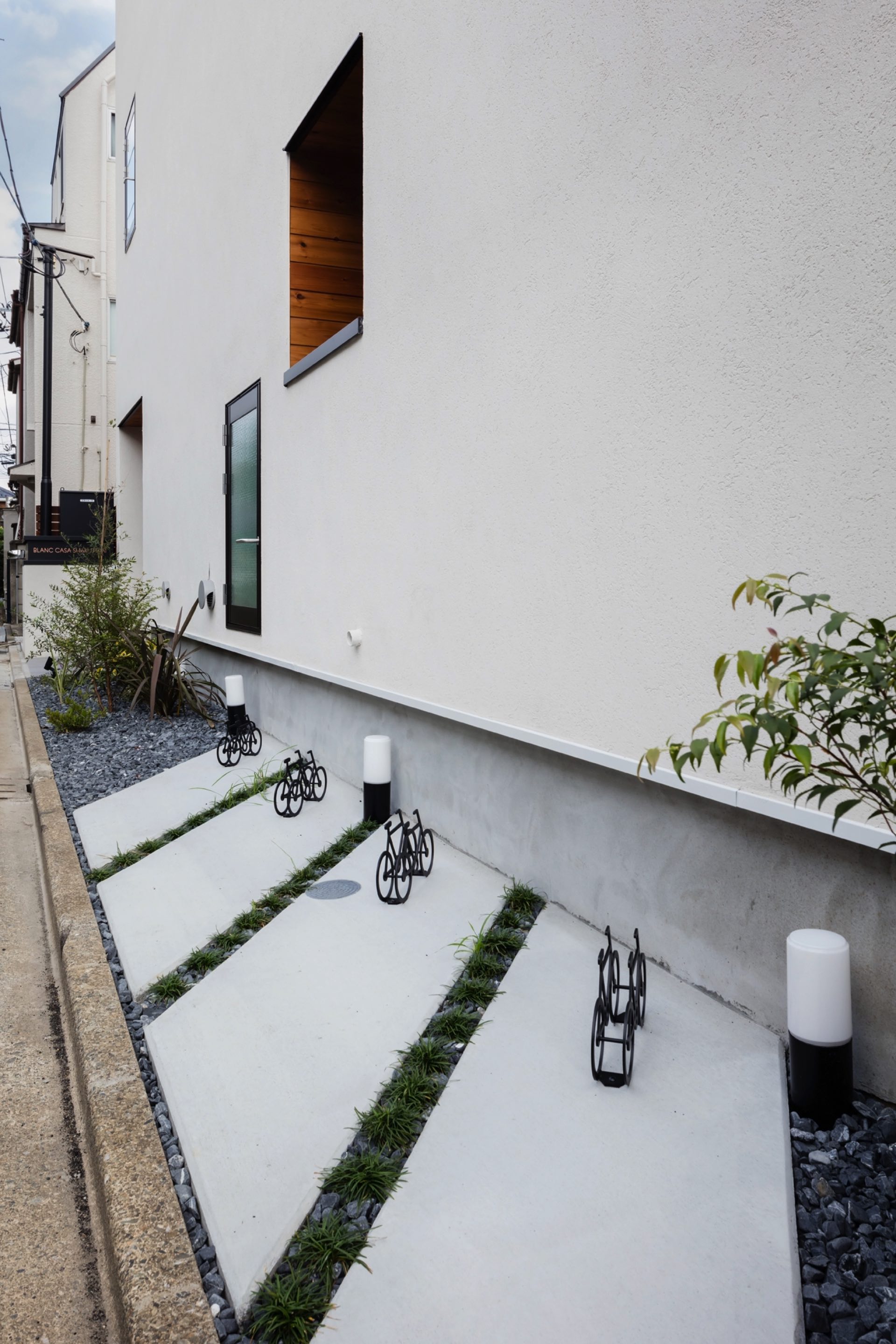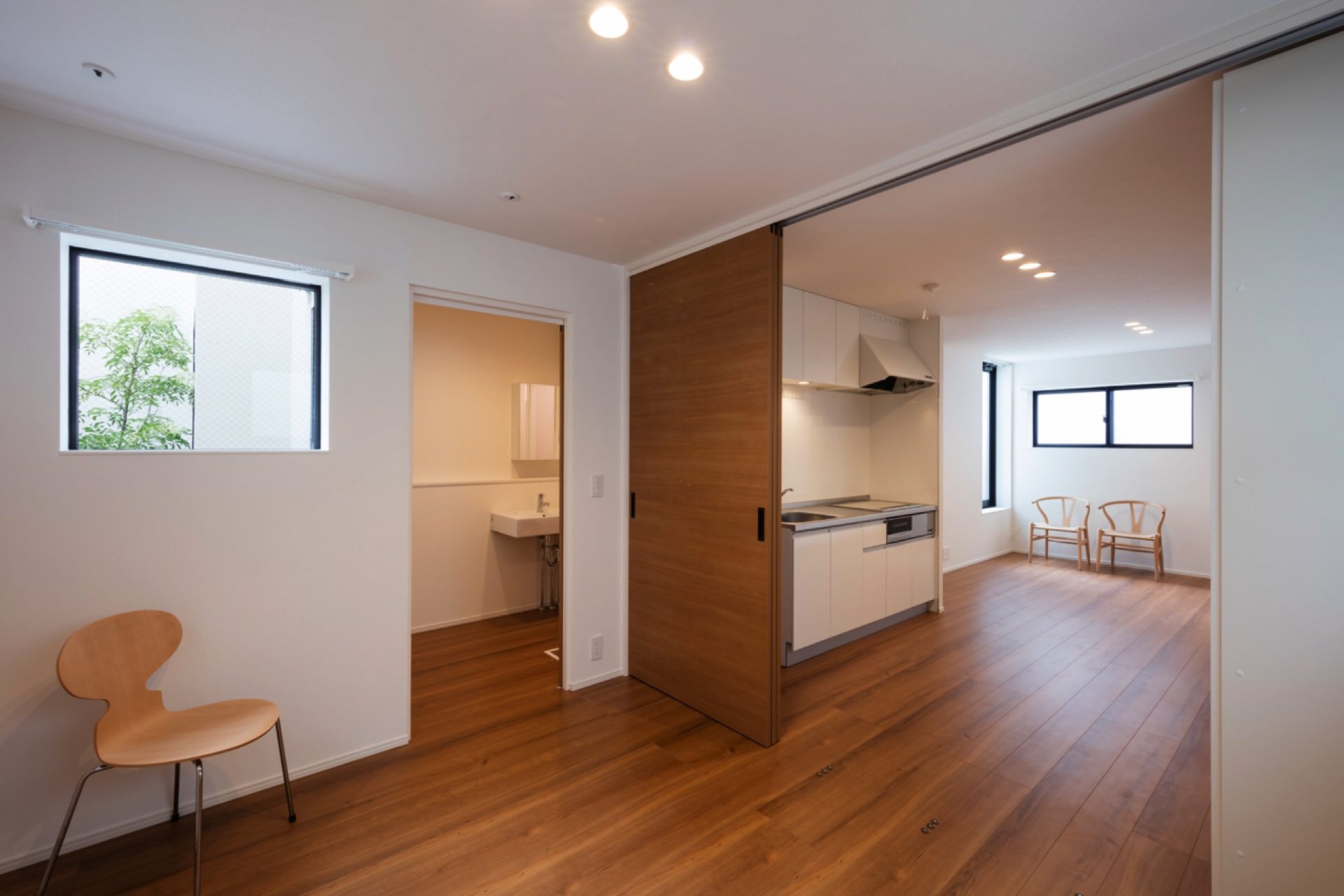 石神井台7丁目の集合住宅 第1種中高層住居専用地域 構造:木造 敷地面積:206.52㎡ 建築面積:123.84㎡ 延床面積:355.26㎡ 住戸数 :9戸 1階ホールは片持ち階段越しに中庭のツリーに目線が抜ける様に演出。エントランスを奥へ引込む事により、ピロティからエントランスへの豊かな動線を構成。内部空間は可動収納や可動間仕切りを使うことにより、大きく部屋を使いたい場合はワンルームへと可変性をもった居室を実現。