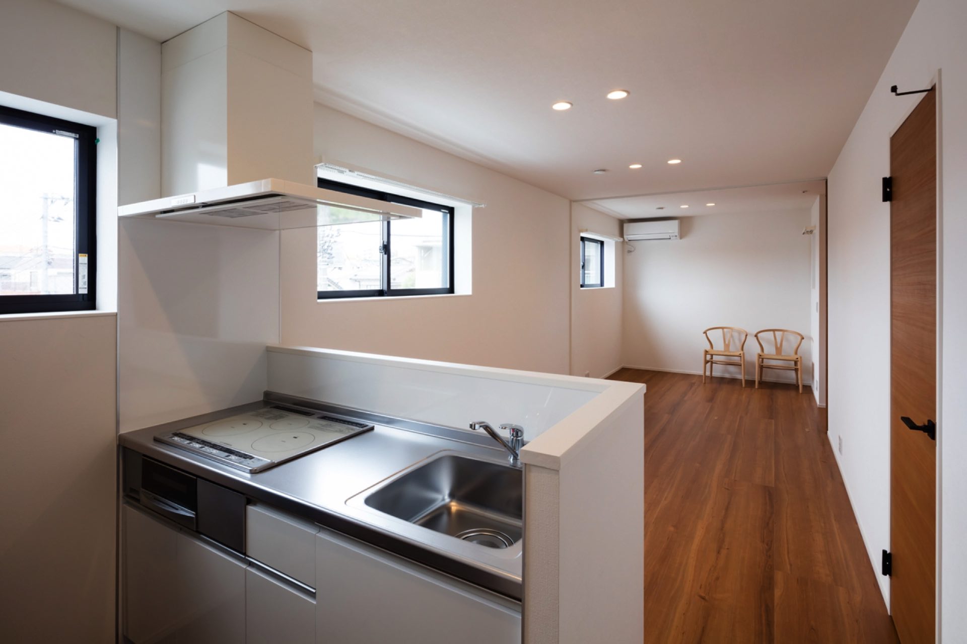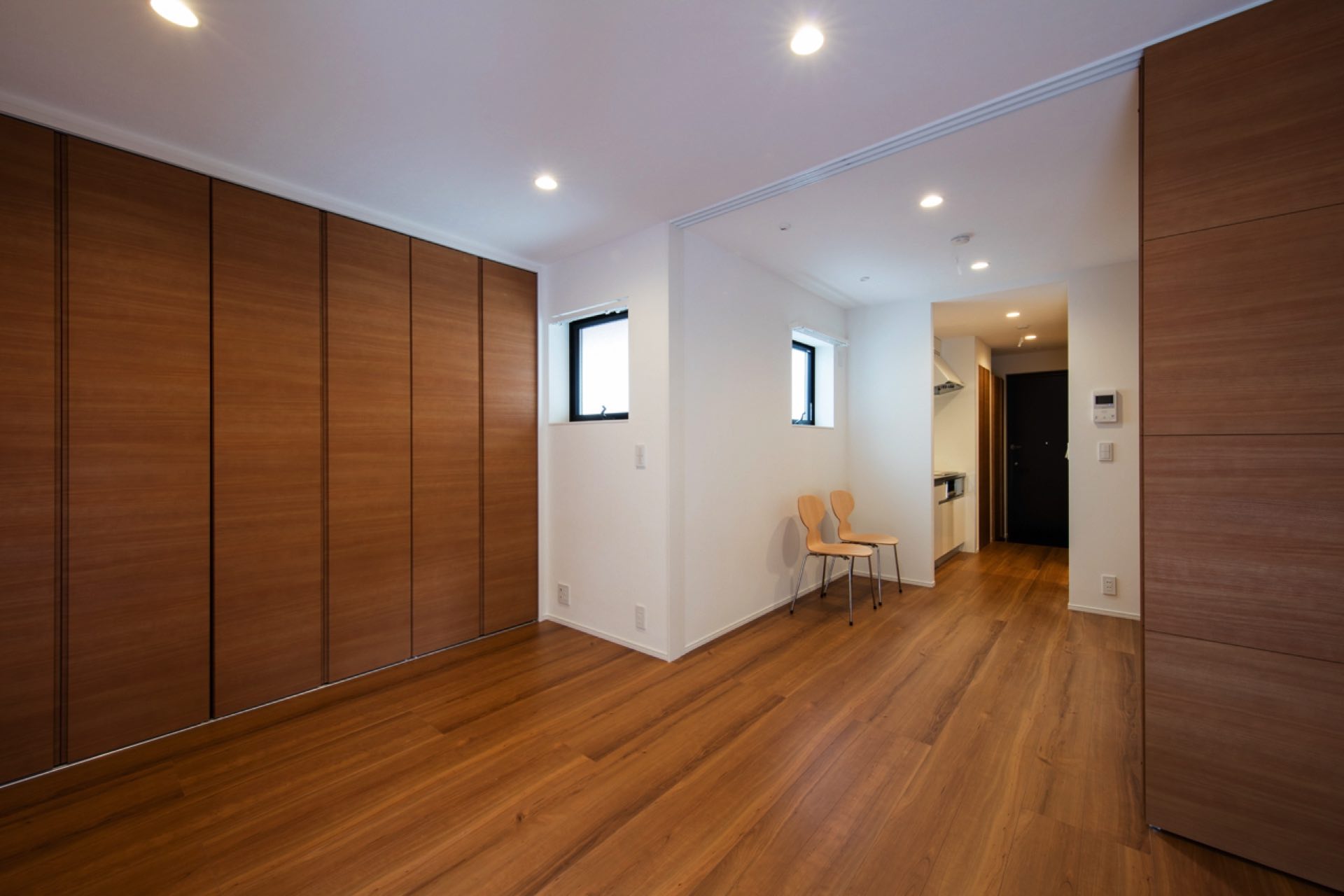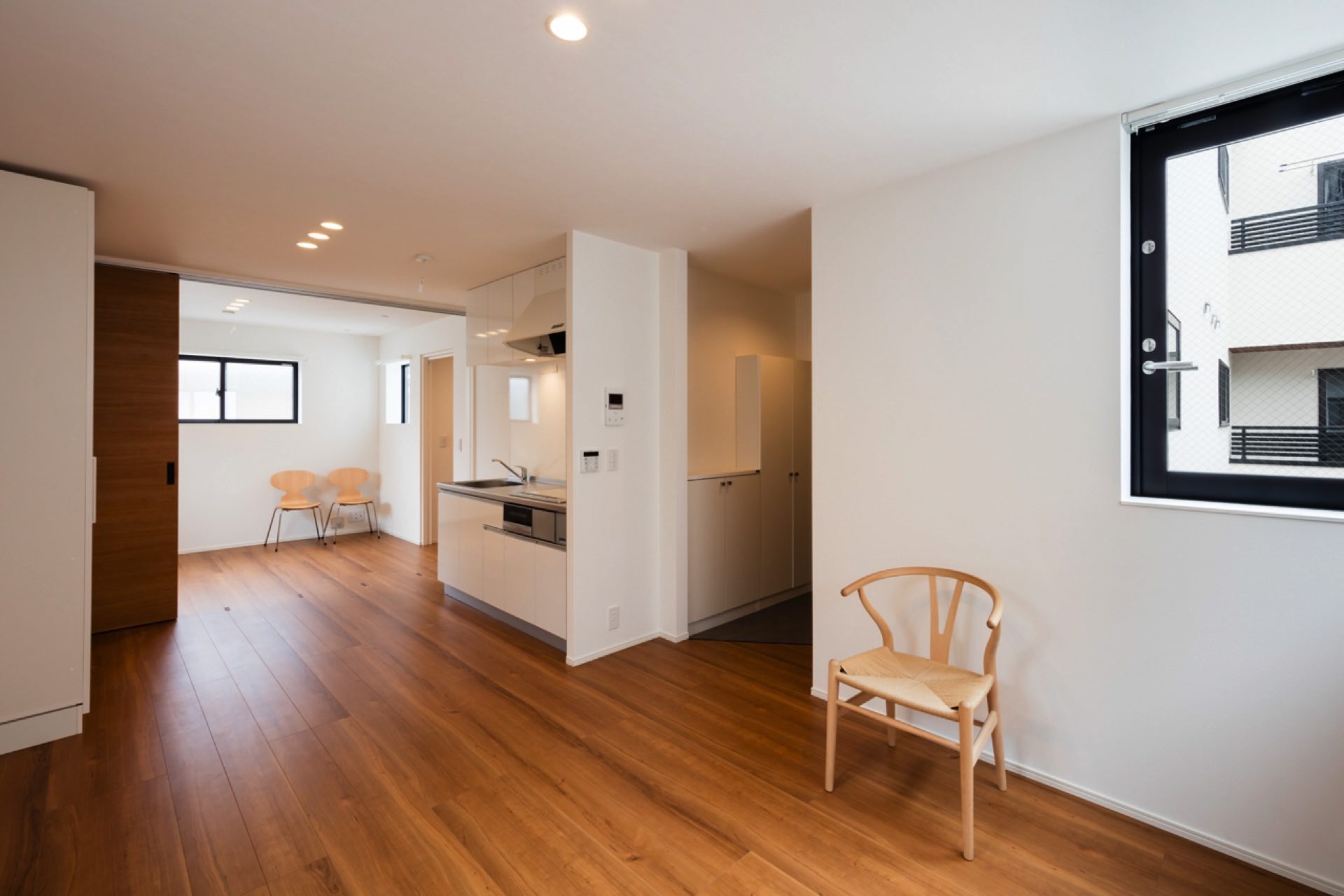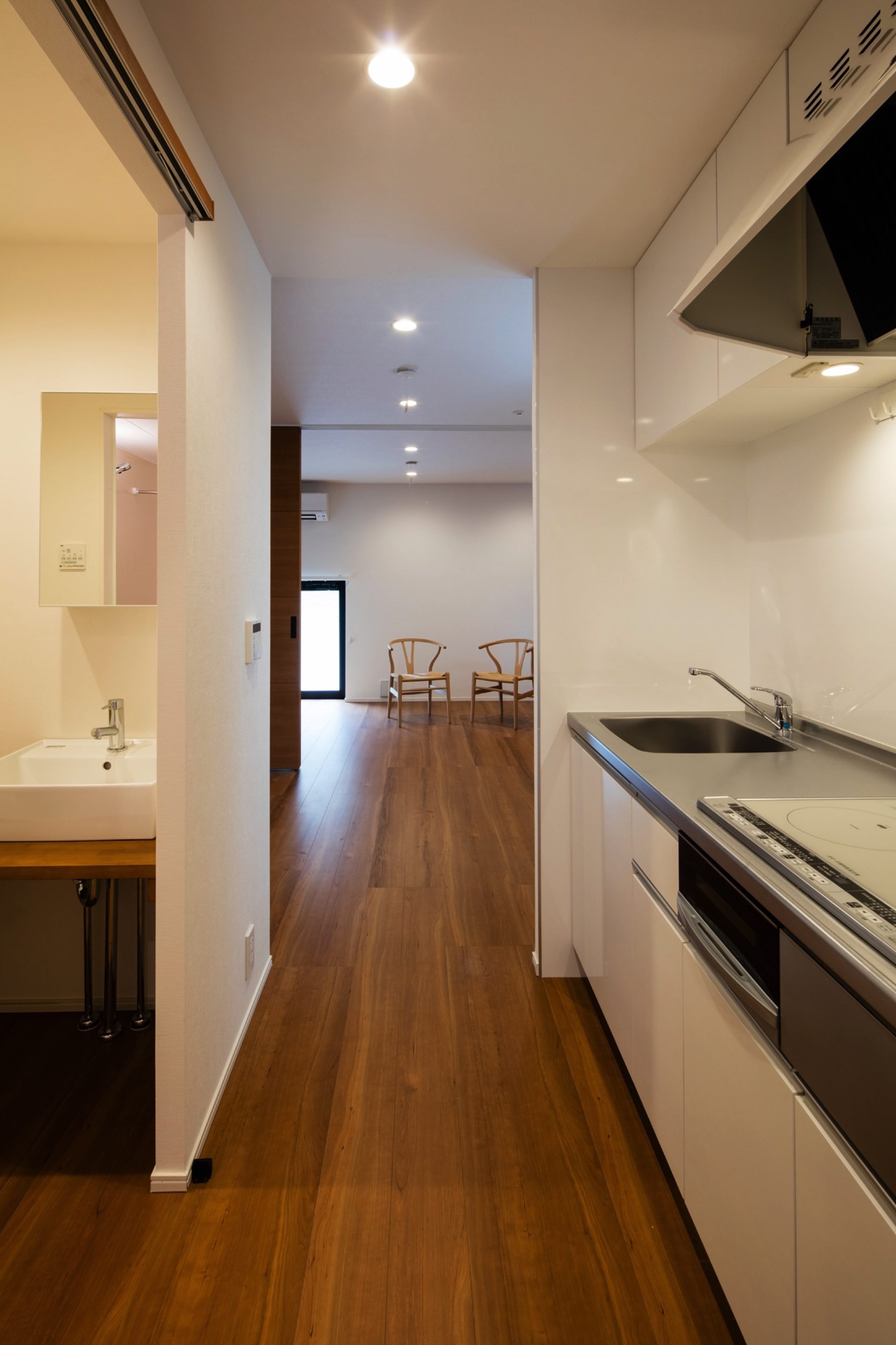 石神井台7丁目の集合住宅 第1種中高層住居専用地域 構造:木造 敷地面積:206.52㎡ 建築面積:123.84㎡ 延床面積:355.26㎡ 住戸数 :9戸 1階ホールは片持ち階段越しに中庭のツリーに目線が抜ける様に演出。エントランスを奥へ引込む事により、ピロティからエントランスへの豊かな動線を構成。内部空間は可動収納や可動間仕切りを使うことにより、大きく部屋を使いたい場合はワンルームへと可変性をもった居室を実現。