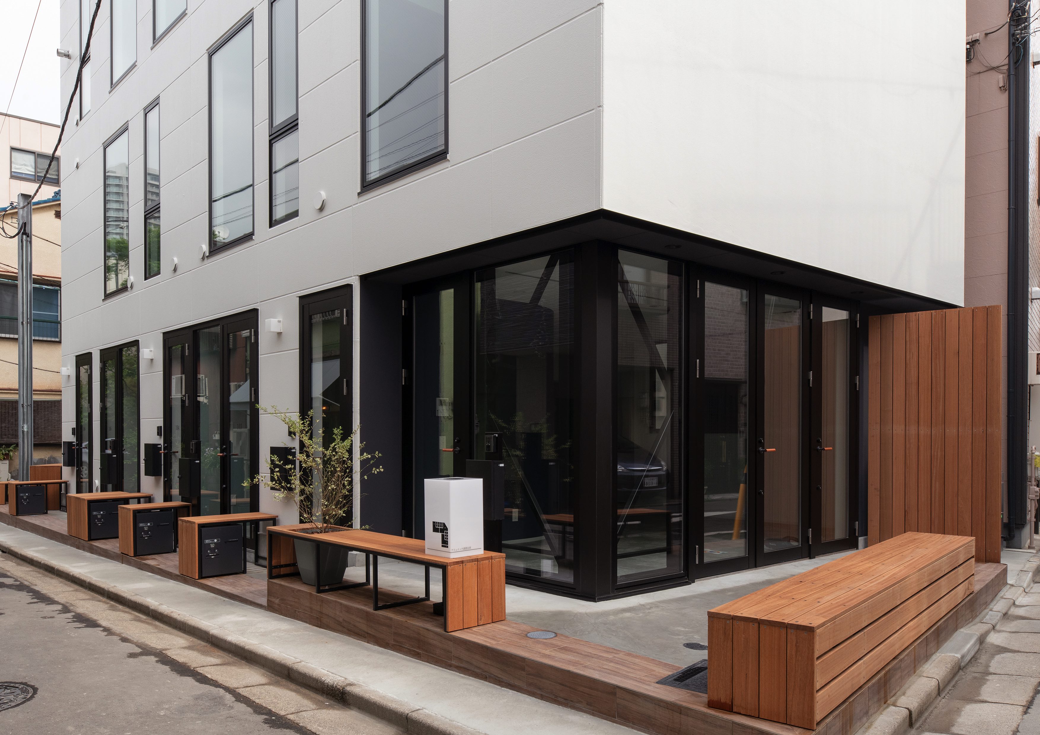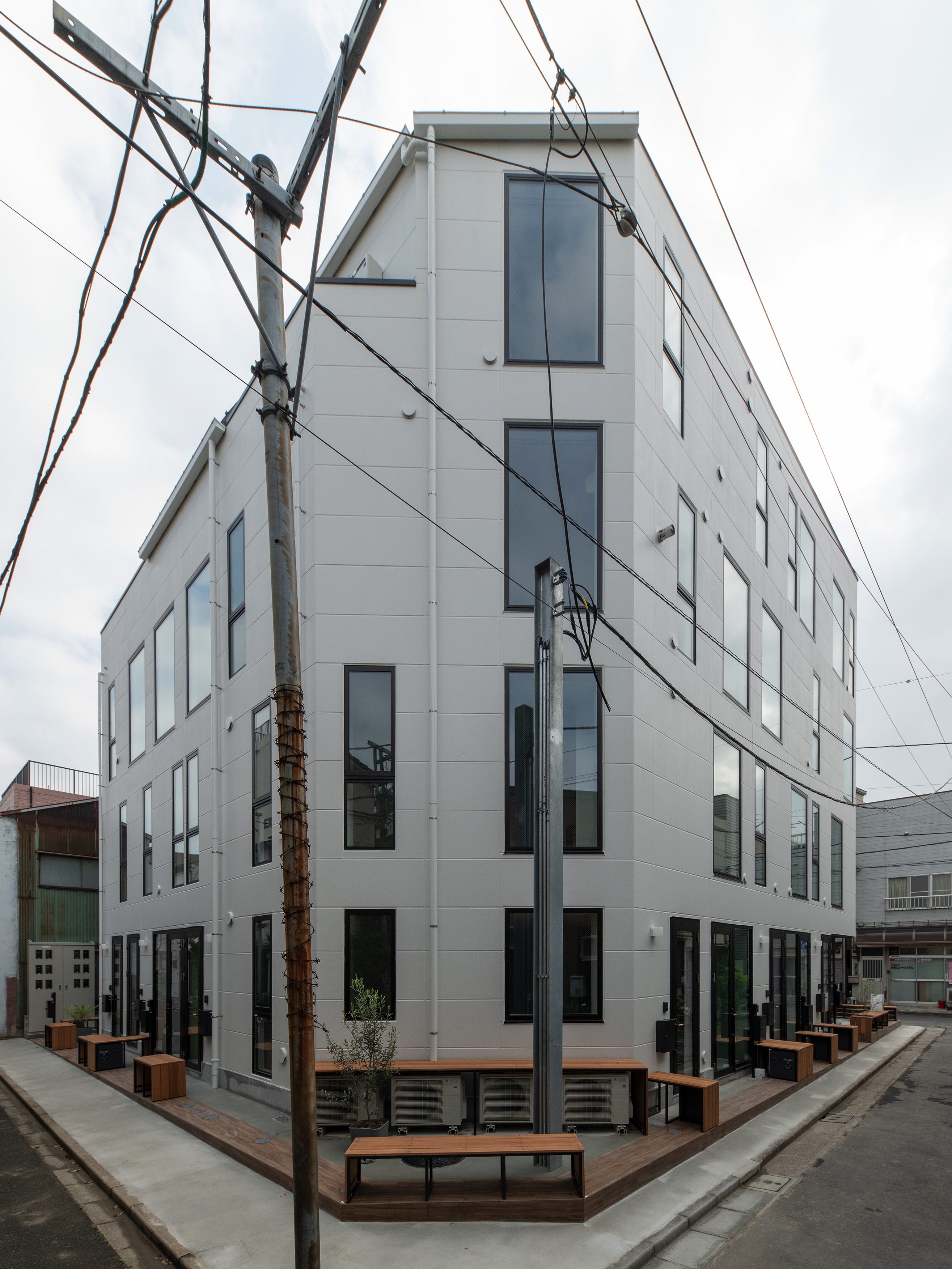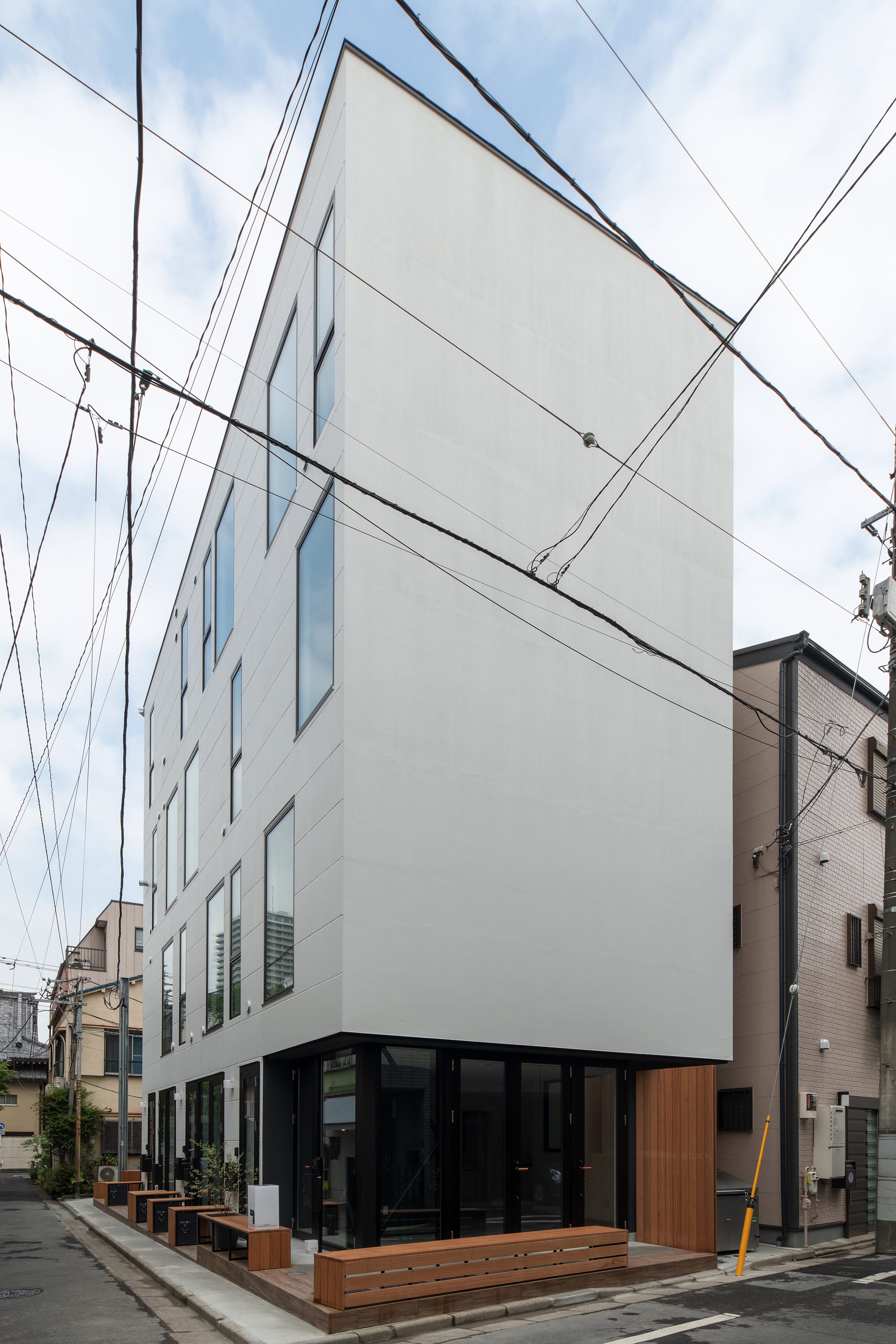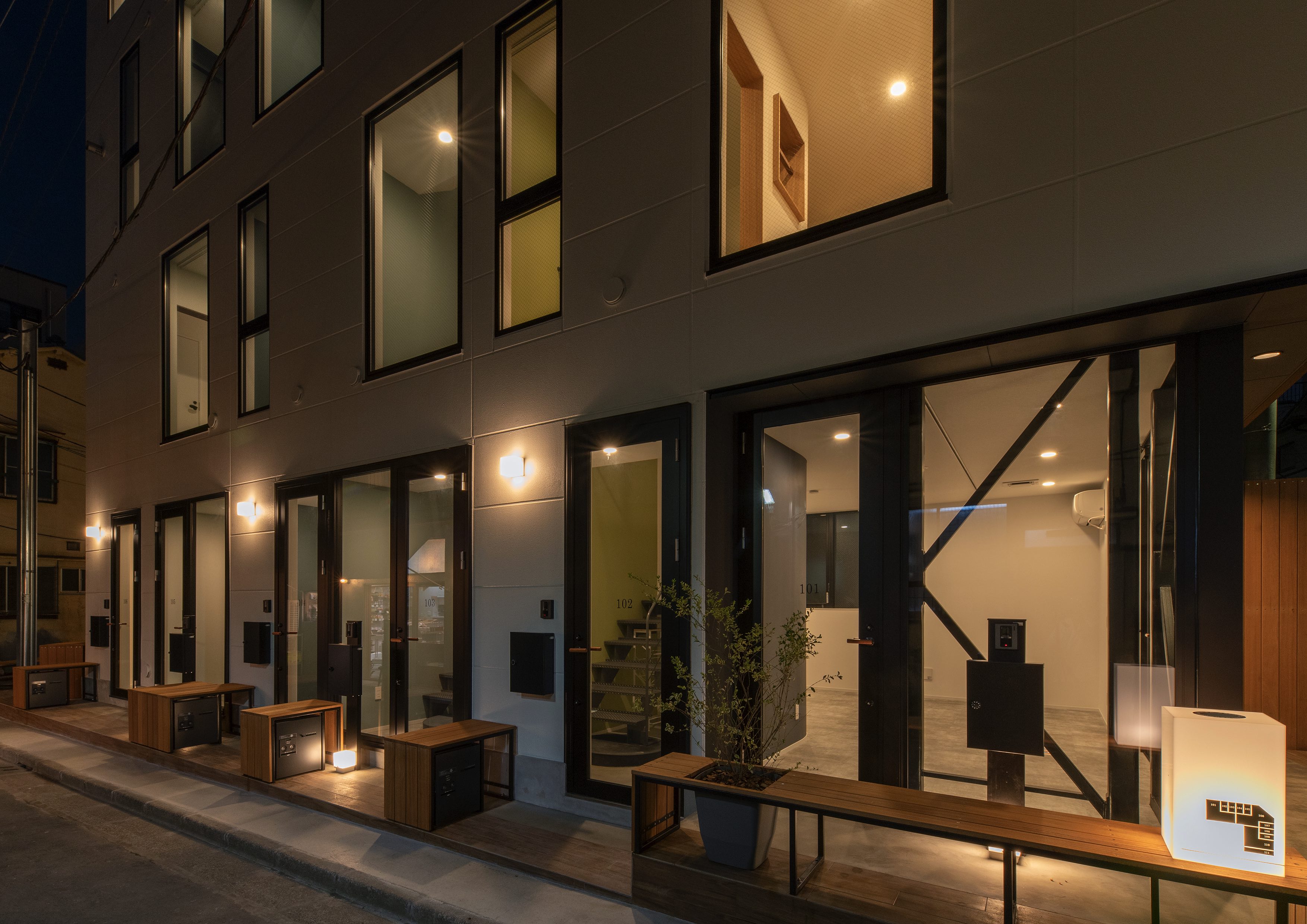 三好2丁目の店舗併用集合住宅 準工業地域 構造:鉄骨造 敷地面積:207.65㎡ 延床面積:553.44㎡ 住戸数 :10戸 店舗数:1店舗 最寄り駅は清澄白河駅、東京都現代美術館にほど近いアーティスト・イン・レジデンスをテーマにした集合住宅。建築面積から差し引いた道路側の空きスペースを街に寄与する空間とする為、ベンチ、ストリートファニチャーを設けている。4階建てすべての住戸の玄関は1階にあり、ガラス越しの玄関とベンチを配することによりコミュニティーの醸成を図っている。