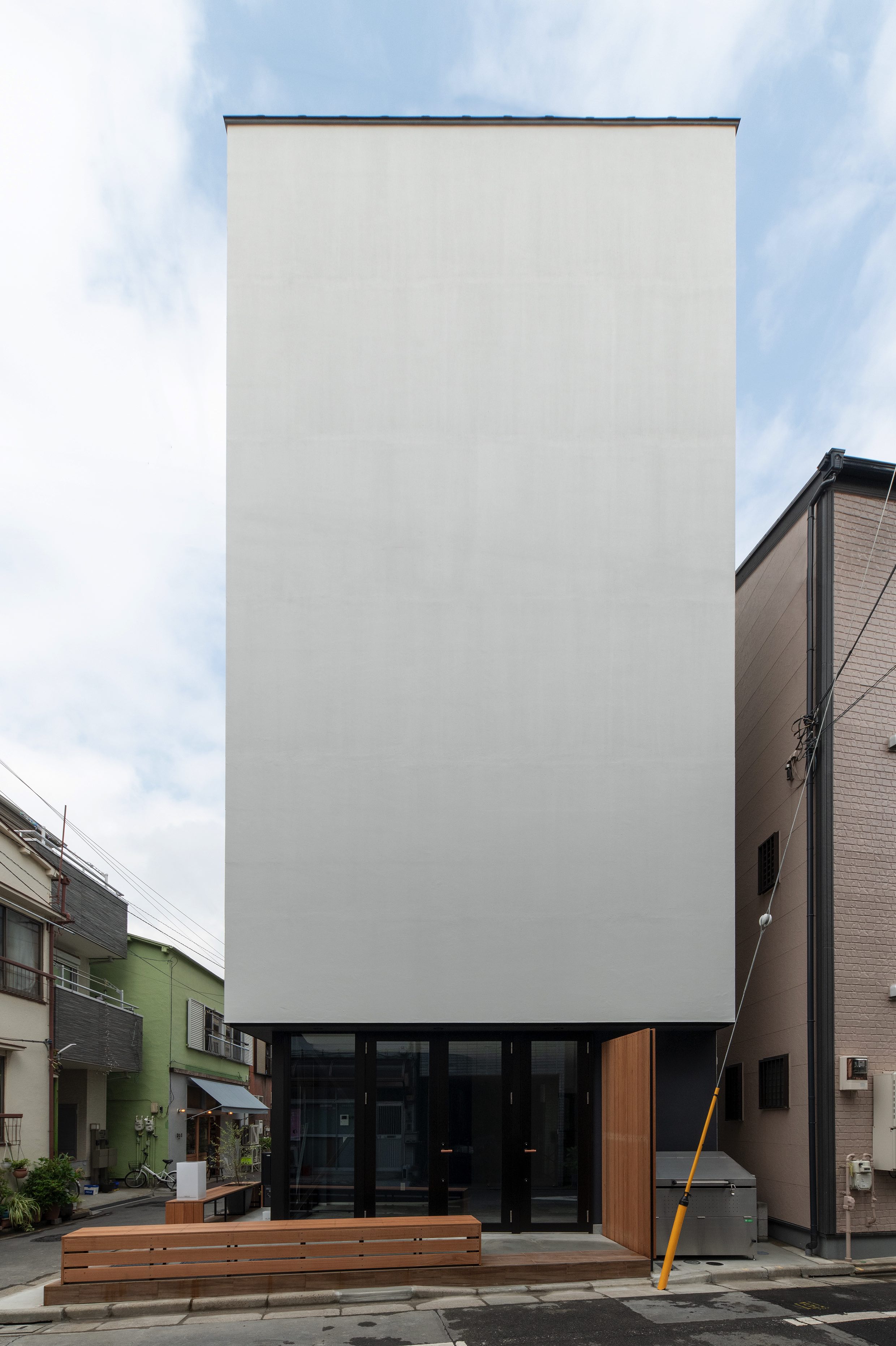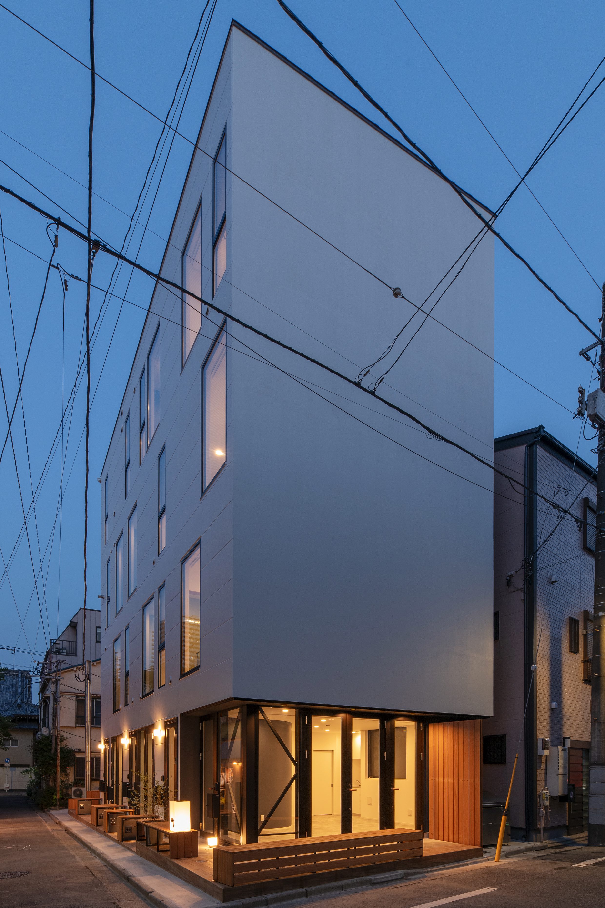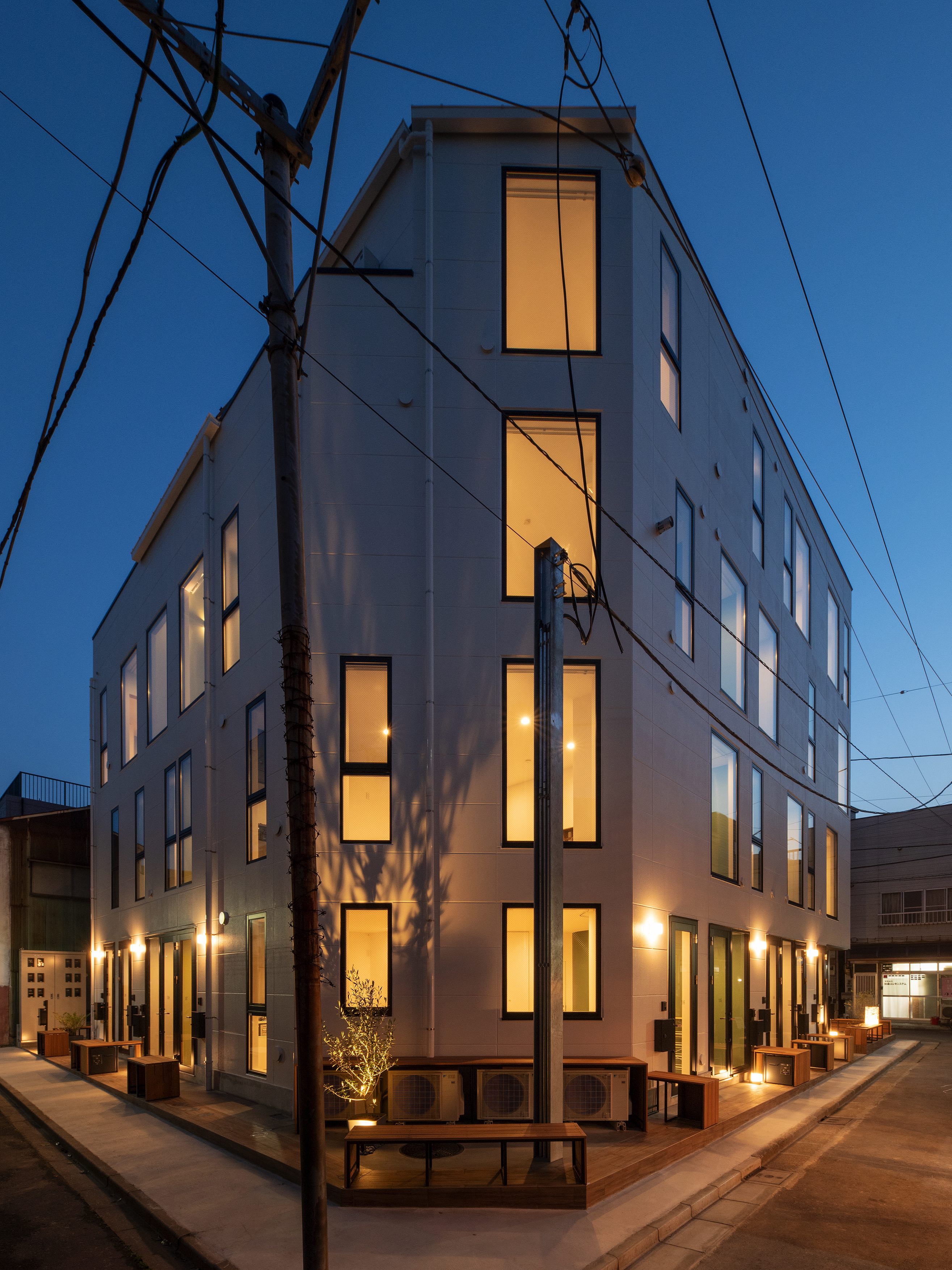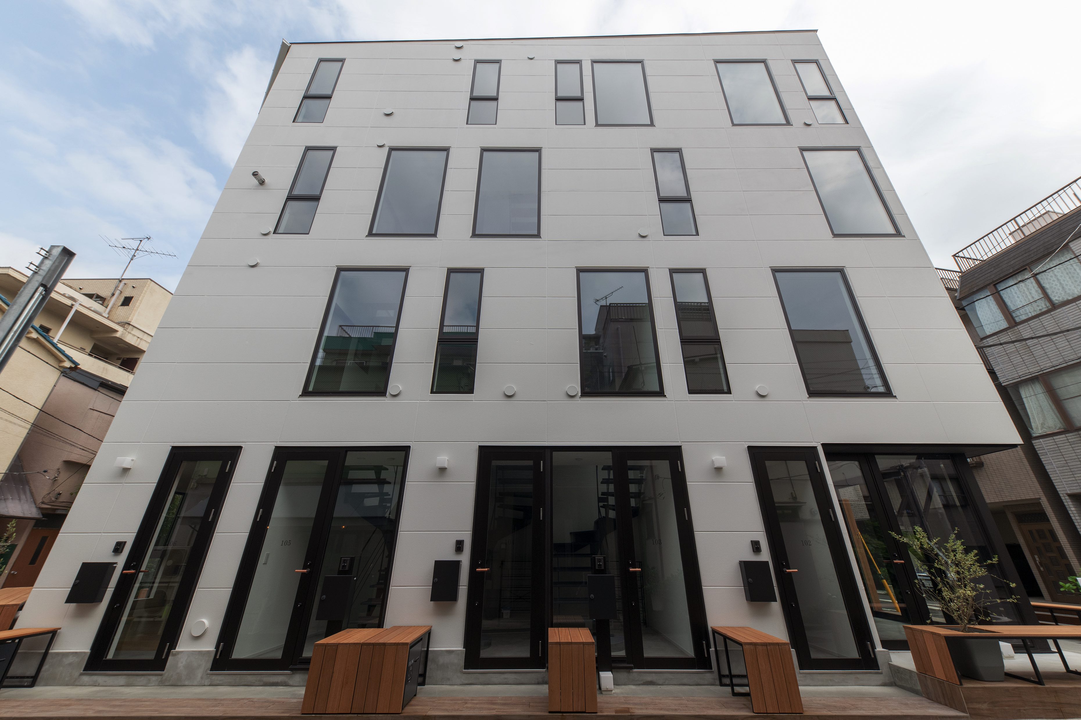 三好2丁目の店舗併用集合住宅 準工業地域 構造:鉄骨造 敷地面積:207.65㎡ 延床面積:553.44㎡ 住戸数 :10戸 店舗数:1店舗 最寄り駅は清澄白河駅、東京都現代美術館にほど近いアーティスト・イン・レジデンスをテーマにした集合住宅。建築面積から差し引いた道路側の空きスペースを街に寄与する空間とする為、ベンチ、ストリートファニチャーを設けている。4階建てすべての住戸の玄関は1階にあり、ガラス越しの玄関とベンチを配することによりコミュニティーの醸成を図っている。