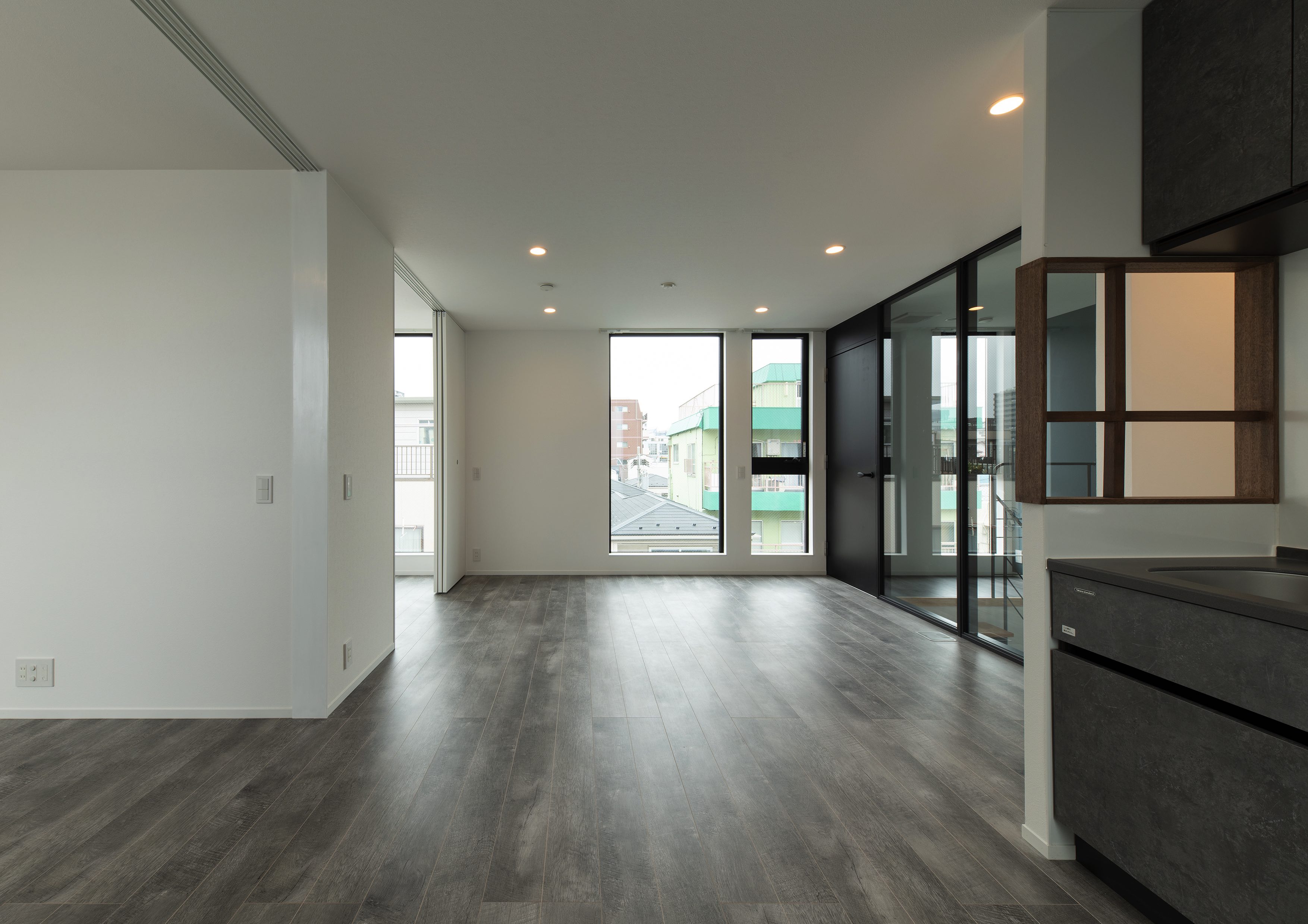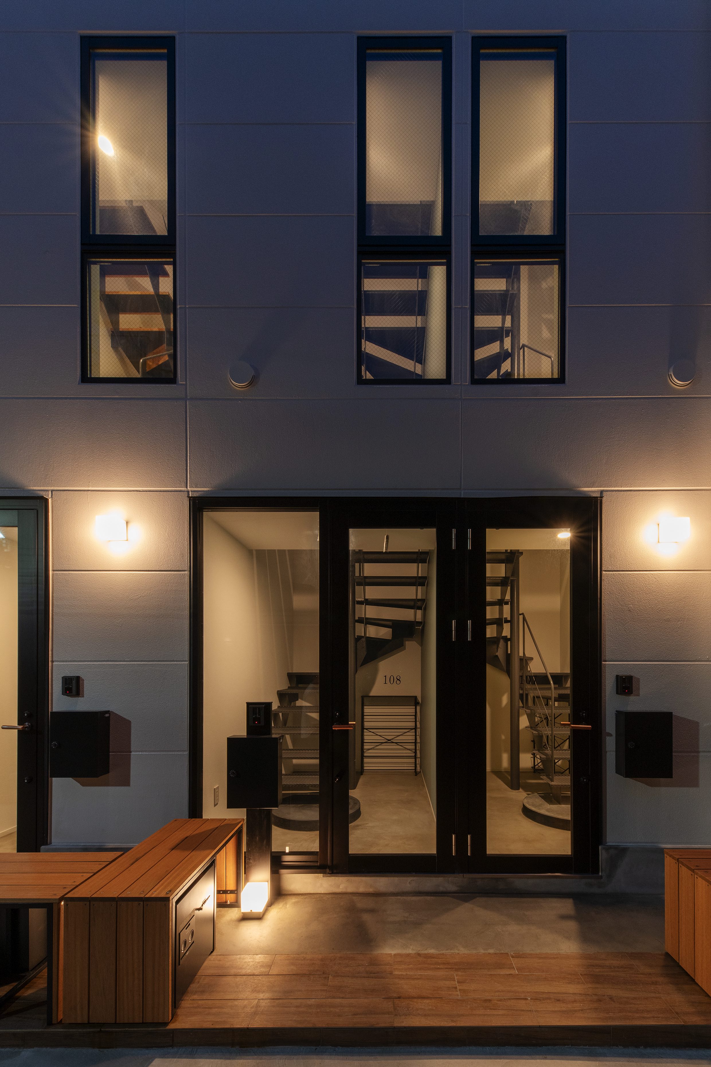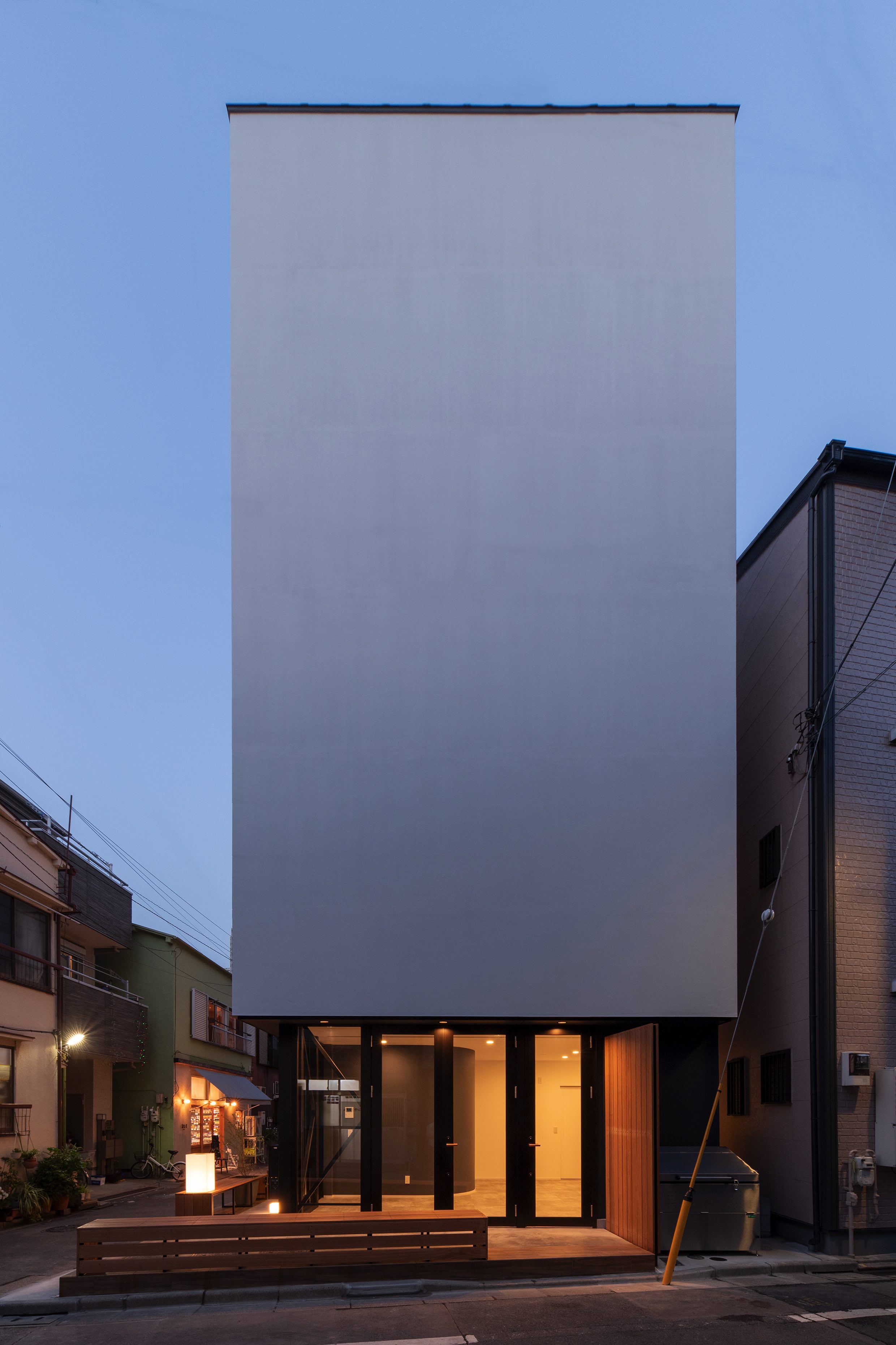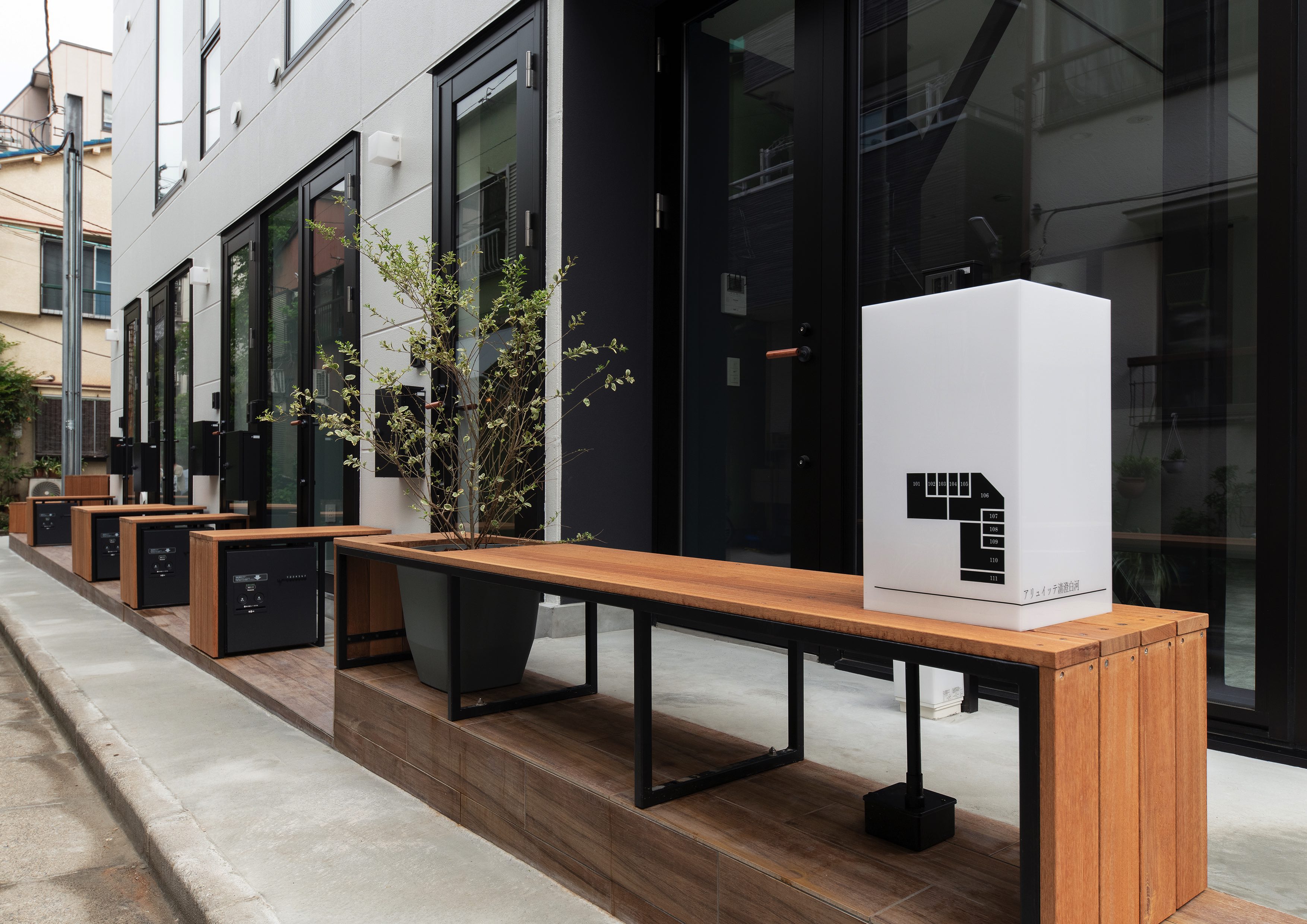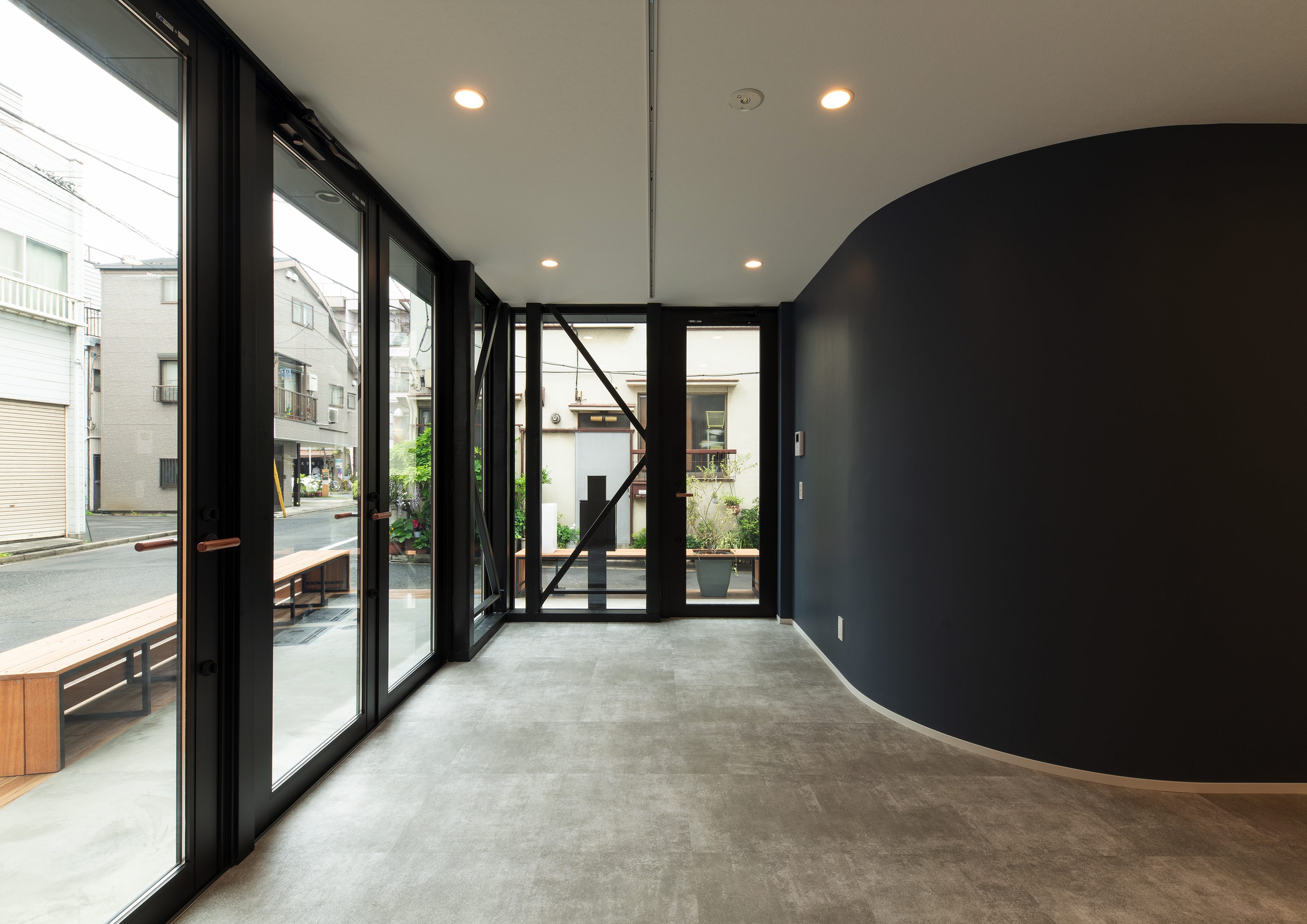 三好2丁目の店舗併用集合住宅 準工業地域 構造:鉄骨造 敷地面積:207.65㎡ 延床面積:553.44㎡ 住戸数 :10戸 店舗数:1店舗 最寄り駅は清澄白河駅、東京都現代美術館にほど近いアーティスト・イン・レジデンスをテーマにした集合住宅。建築面積から差し引いた道路側の空きスペースを街に寄与する空間とする為、ベンチ、ストリートファニチャーを設けている。4階建てすべての住戸の玄関は1階にあり、ガラス越しの玄関とベンチを配することによりコミュニティーの醸成を図っている。