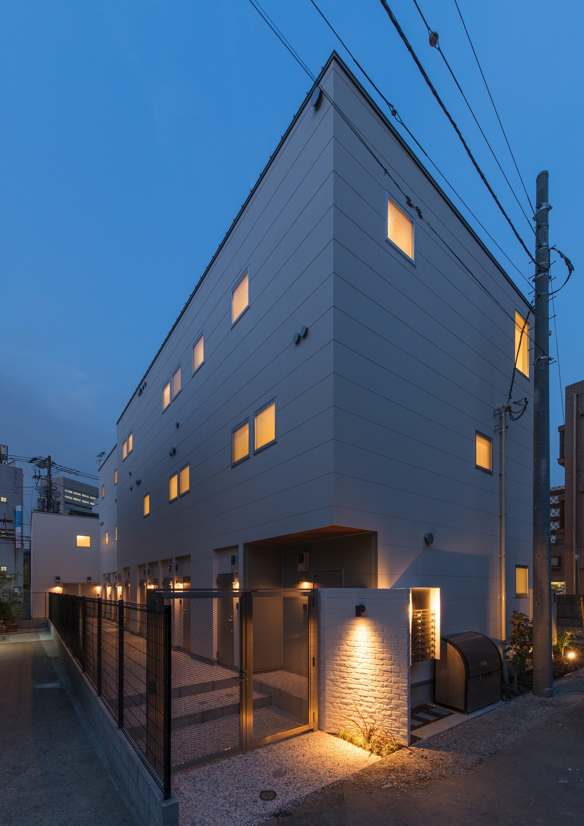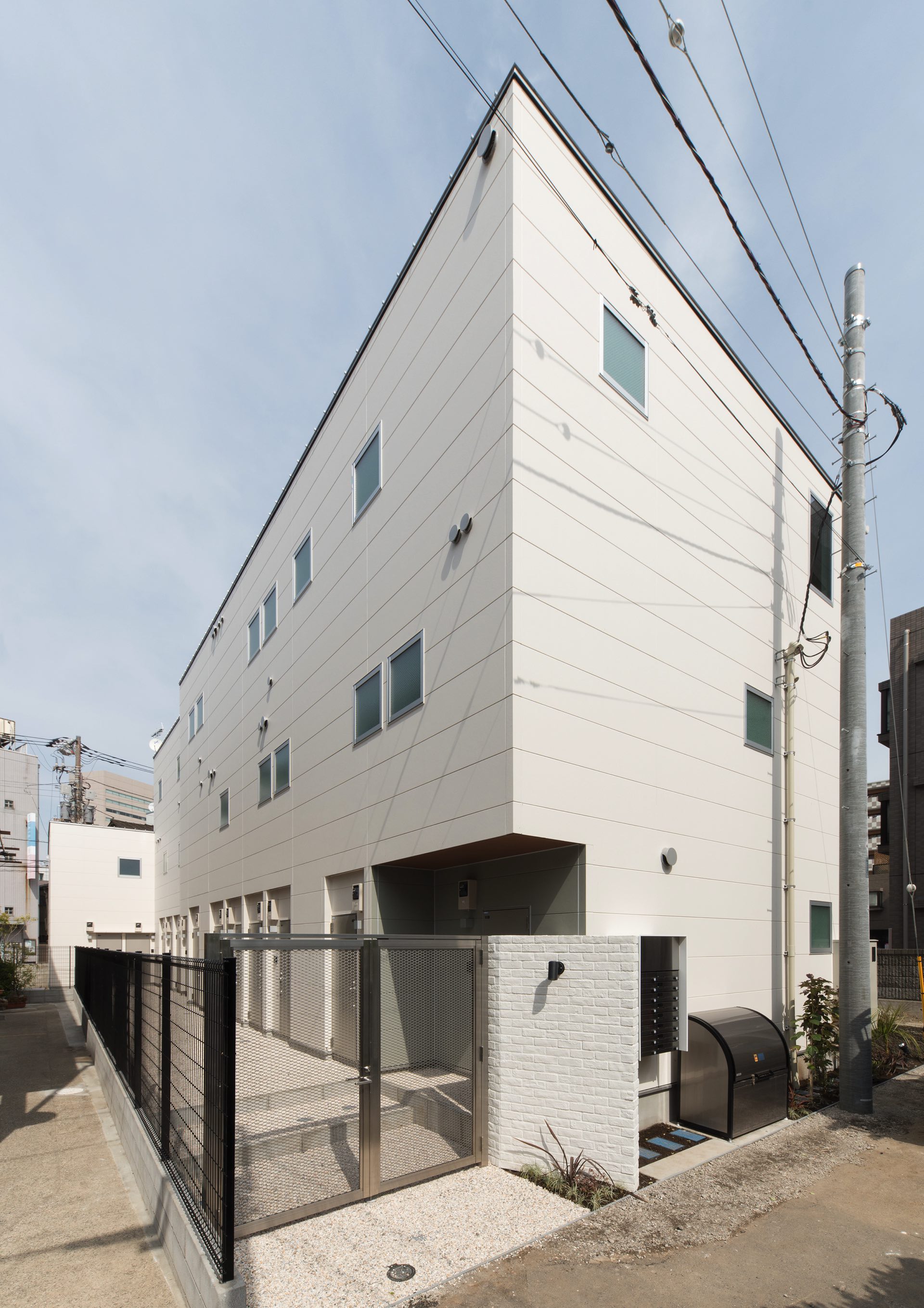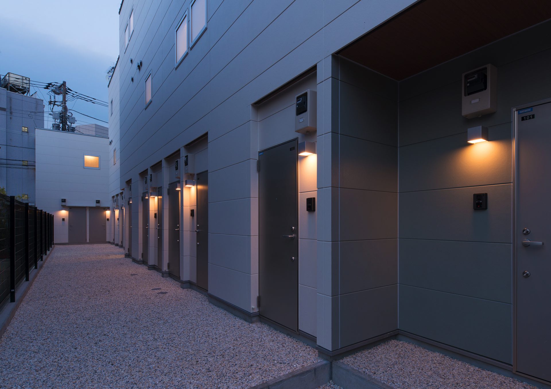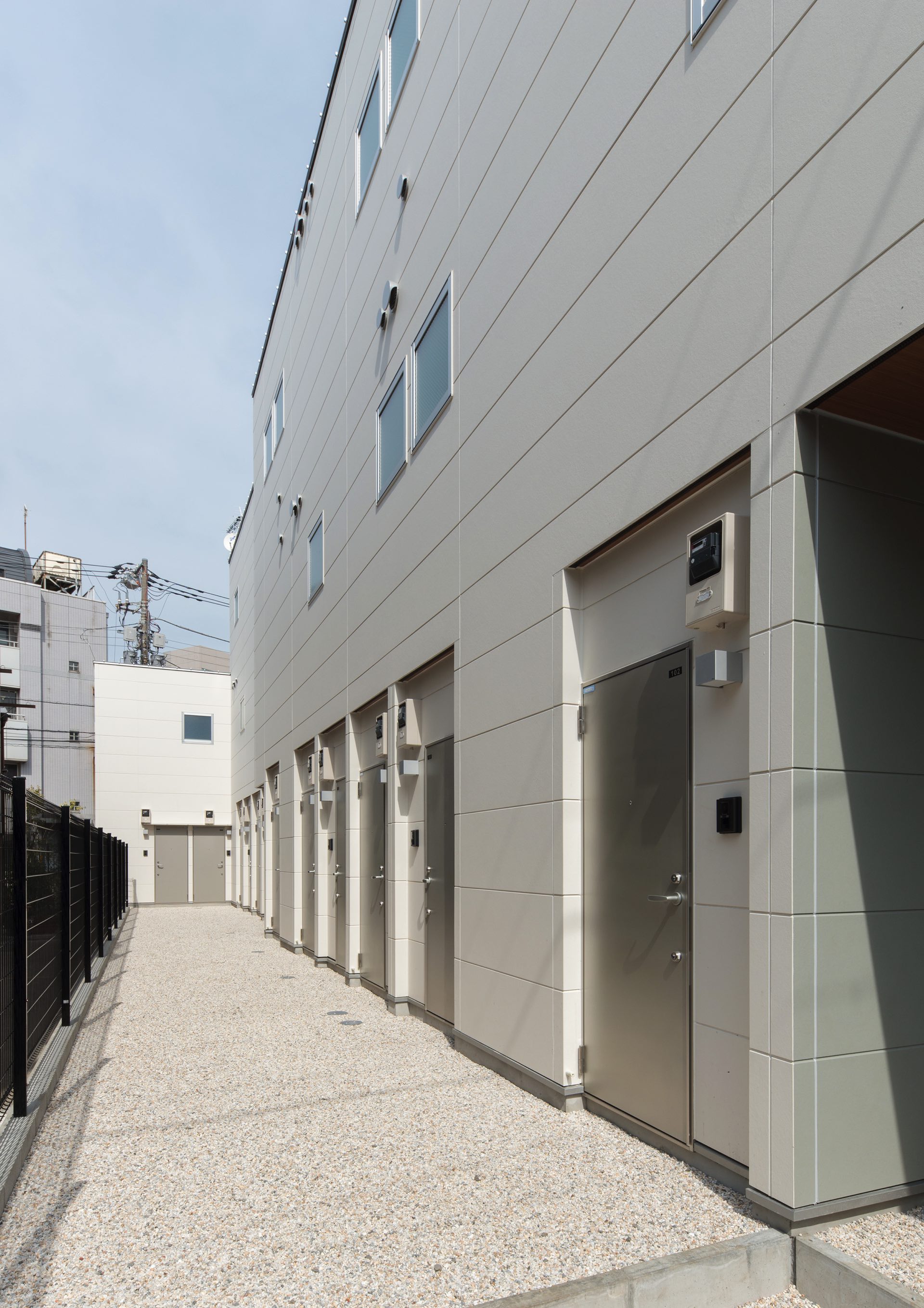 品川区東大井1丁目の集合住宅 準工業地域 構造:木造 敷地面積:317.06㎡ 建築面積:180.09㎡ 延床面積:499.95㎡ 住戸数 :14戸 様々な入居者に対応する為に、全14戸間取りが異なる。ワンルーム・1LDK・2LDKと様々な家族のシーンに寄り添う構成になっている。全住戸は2面採光を取入れ明るい空間とし、外構のアプローチはヒールを履いても歩ける特殊な砂利敷きを行い、水はけも良く既視感の無い新鮮さ醸成している。