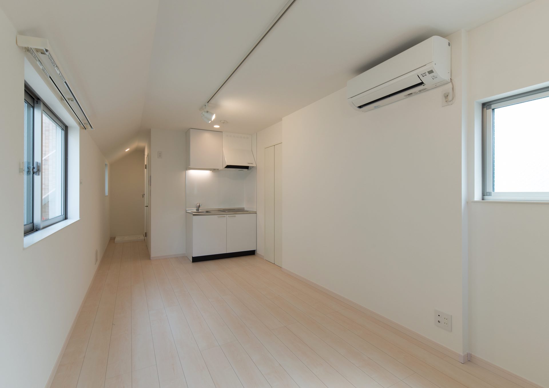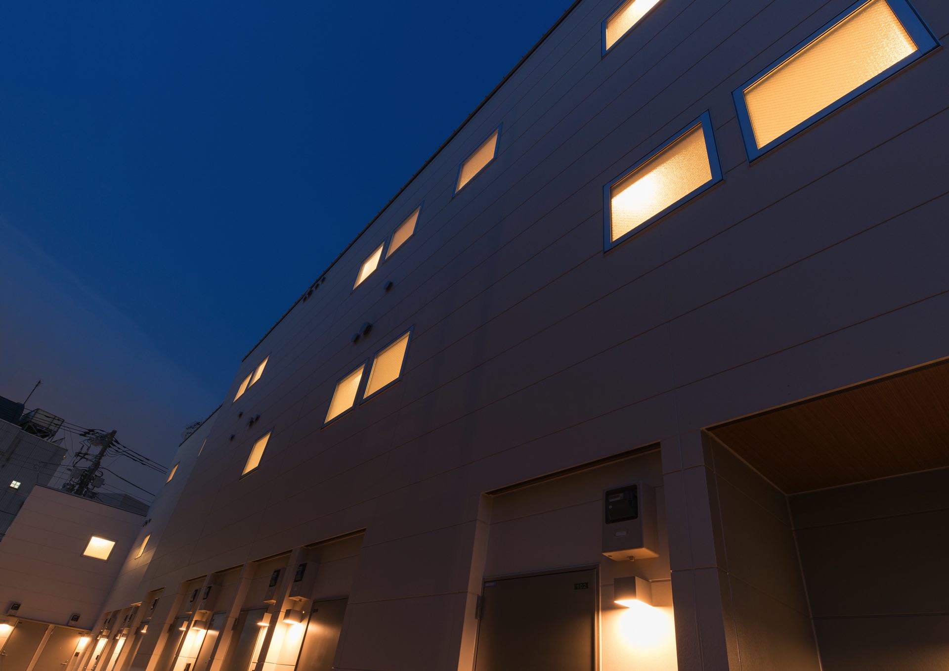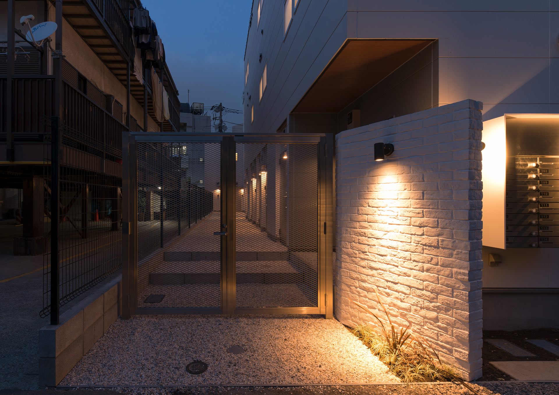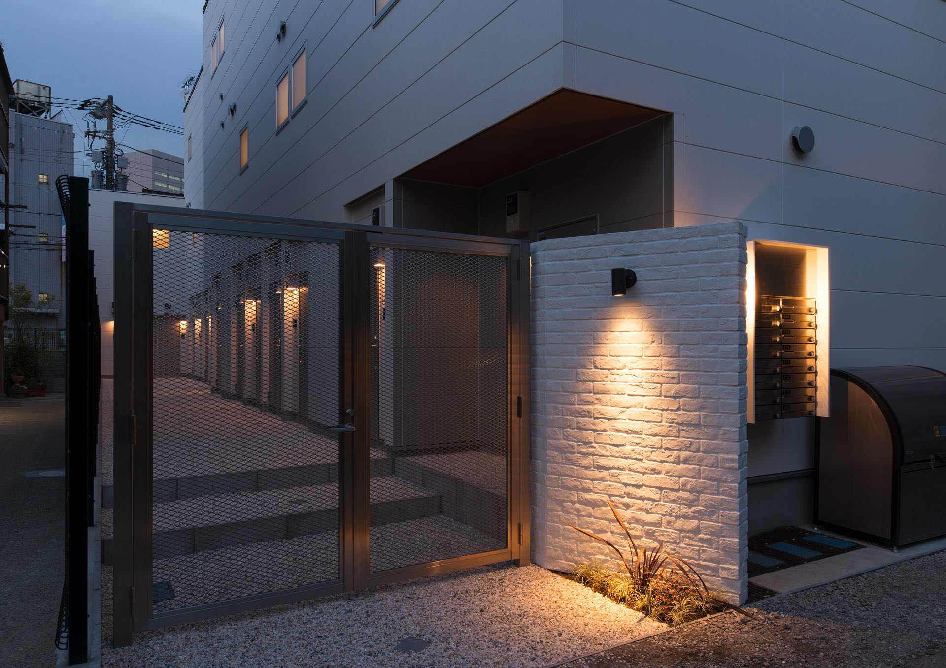 品川区東大井1丁目の集合住宅 準工業地域 構造:木造 敷地面積:317.06㎡ 建築面積:180.09㎡ 延床面積:499.95㎡ 住戸数 :14戸 様々な入居者に対応する為に、全14戸間取りが異なる。ワンルーム・1LDK・2LDKと様々な家族のシーンに寄り添う構成になっている。全住戸は2面採光を取入れ明るい空間とし、外構のアプローチはヒールを履いても歩ける特殊な砂利敷きを行い、水はけも良く既視感の無い新鮮さ醸成している。