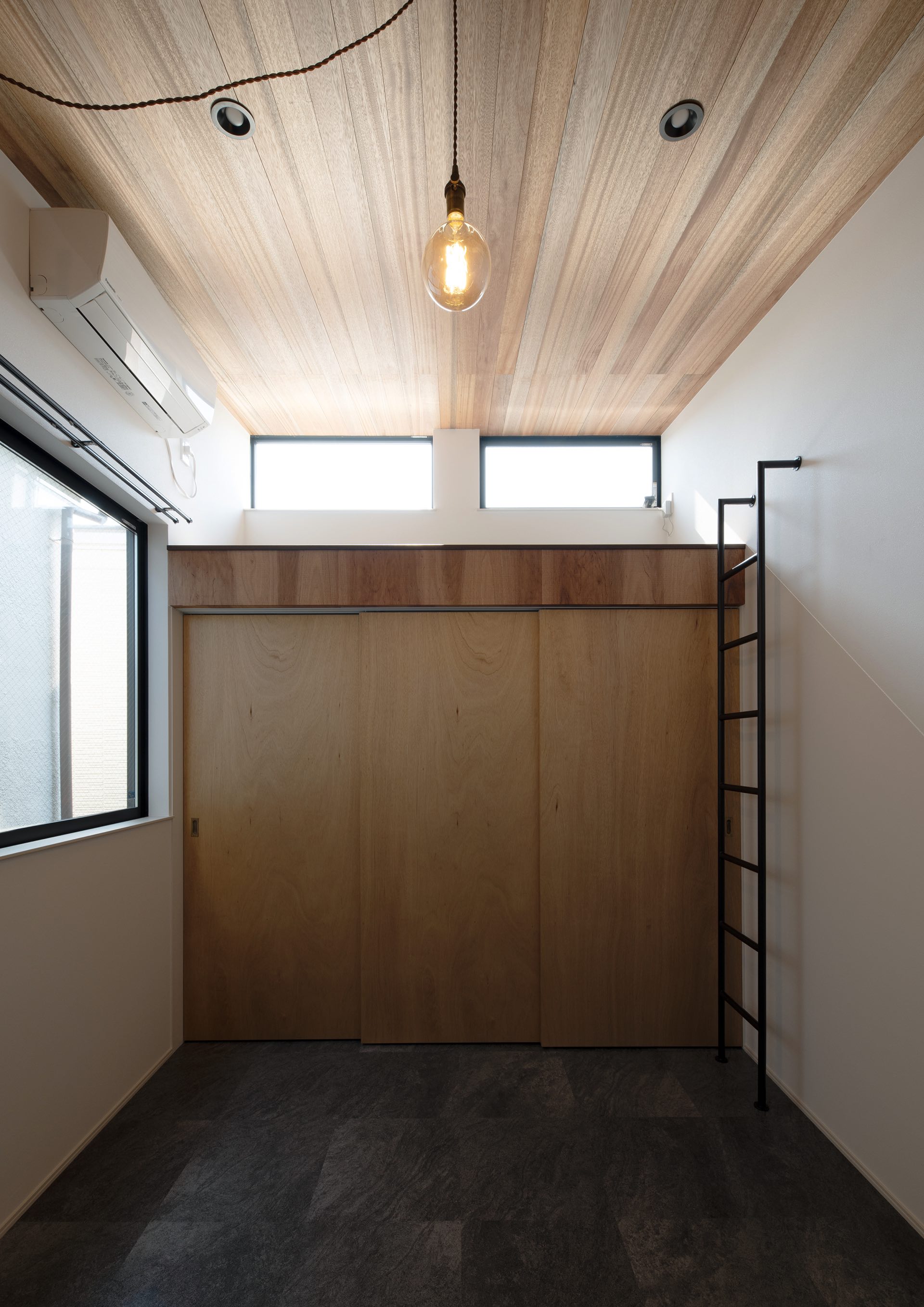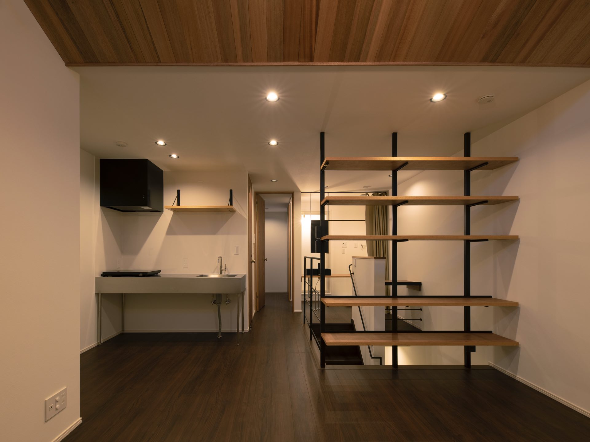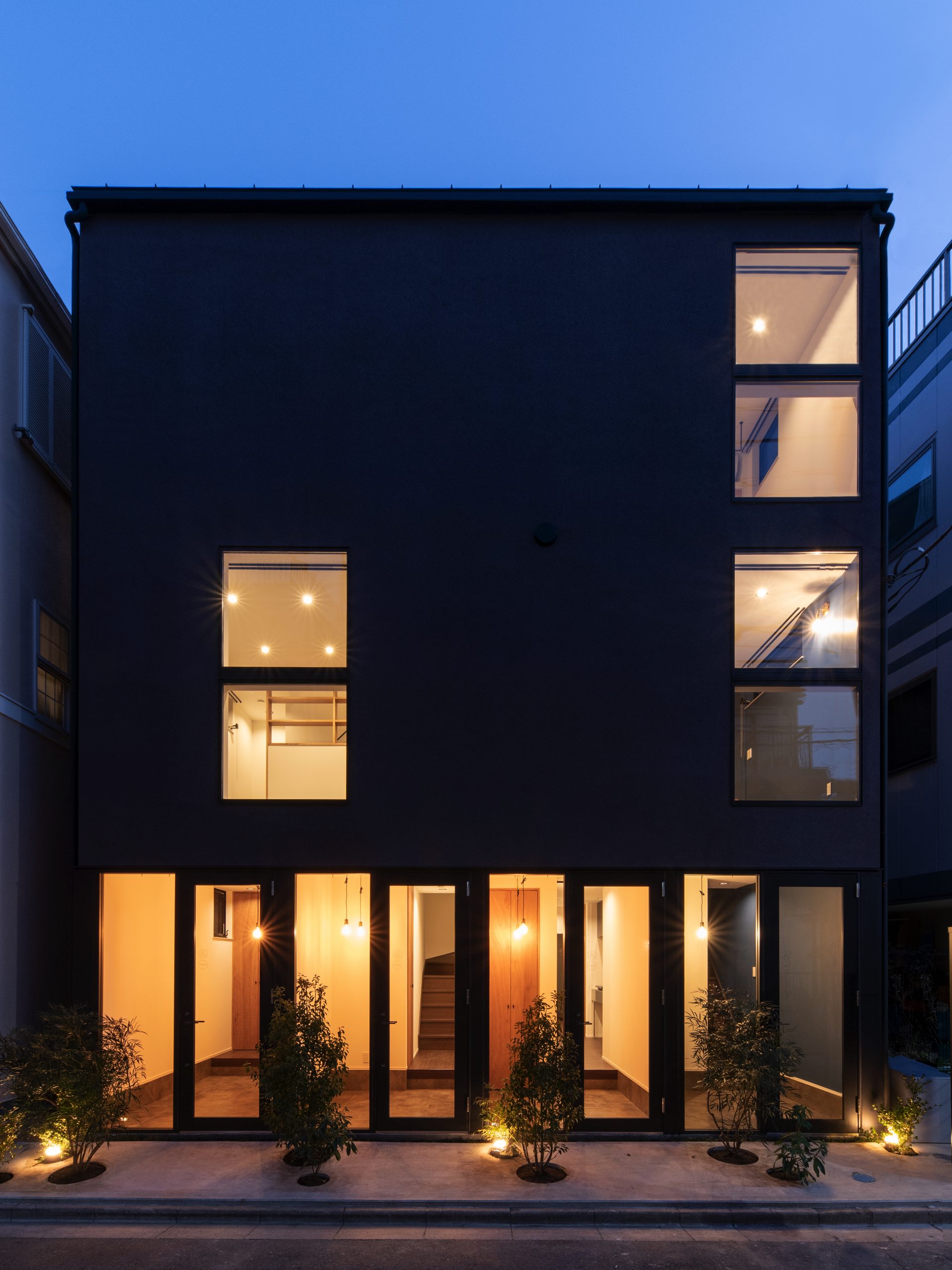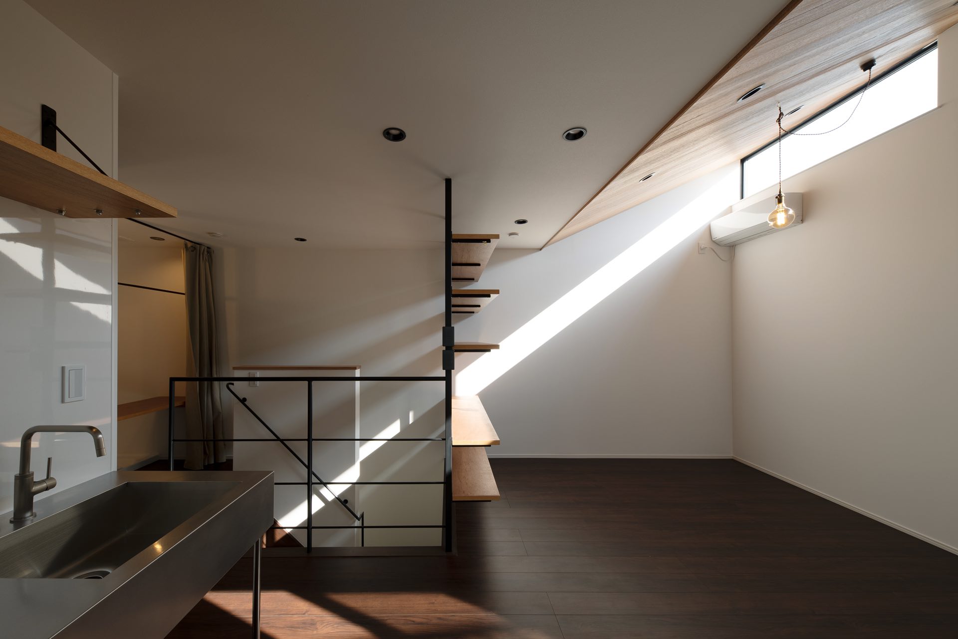 東尾久四丁目の集合住宅 準工業地域 構造:木造 敷地面積:102.30㎡ 延床面積:181.81㎡ 住戸数 :4戸 ファサード面は玄関ドアとFIXの水平連続窓を設けるアイコニックな外観。屋根勾配を利用したハイサイドライトから南の採光を取り入れた明るいLDK。天井面の内装は木羽目板を使用した高級仕様、コストバランスとコントラストを利かせたデザイン。