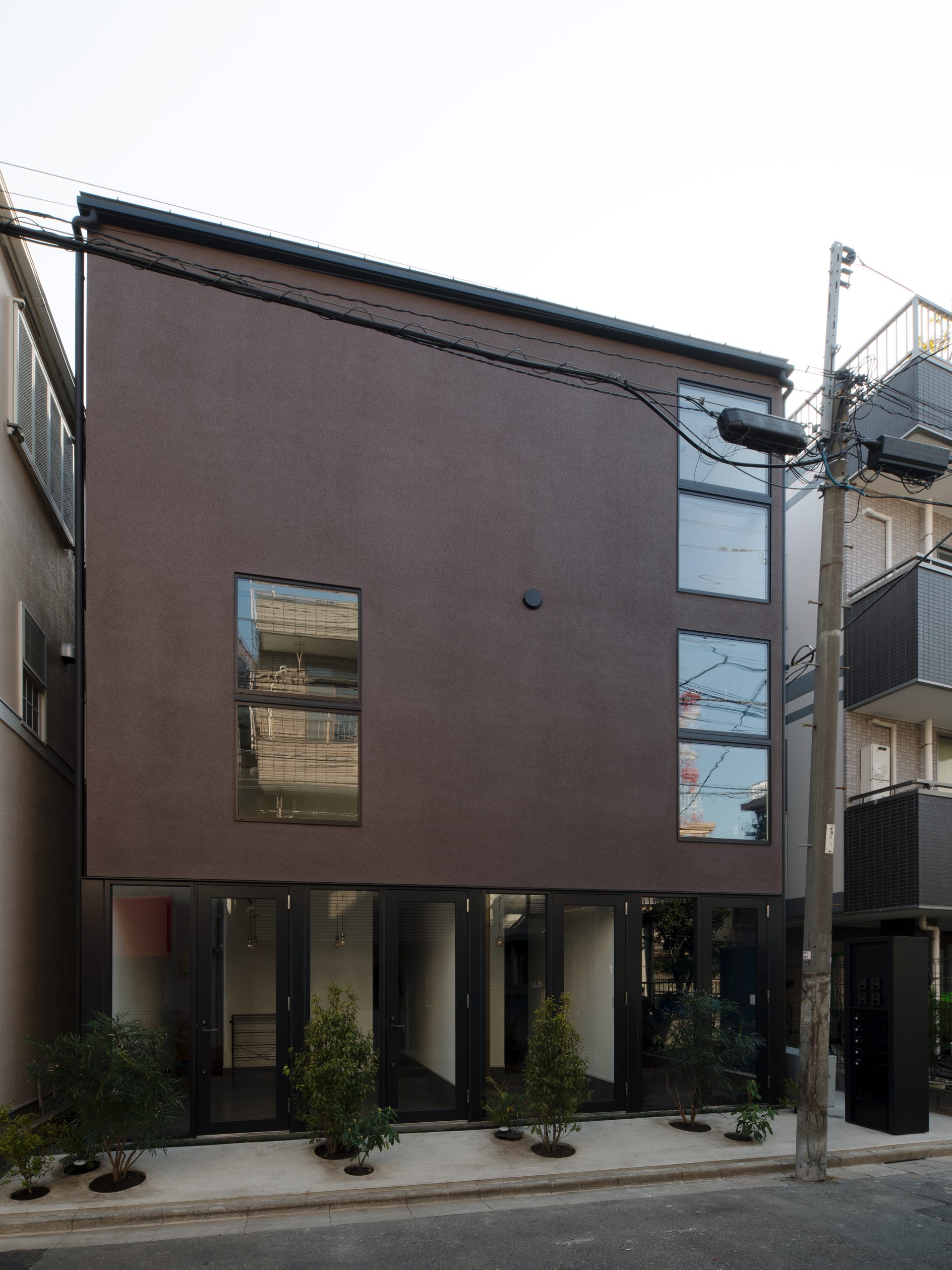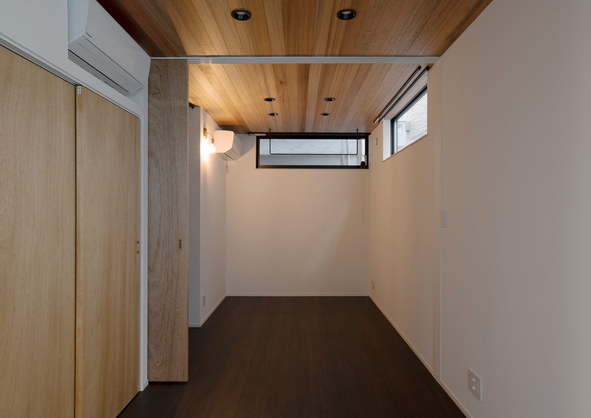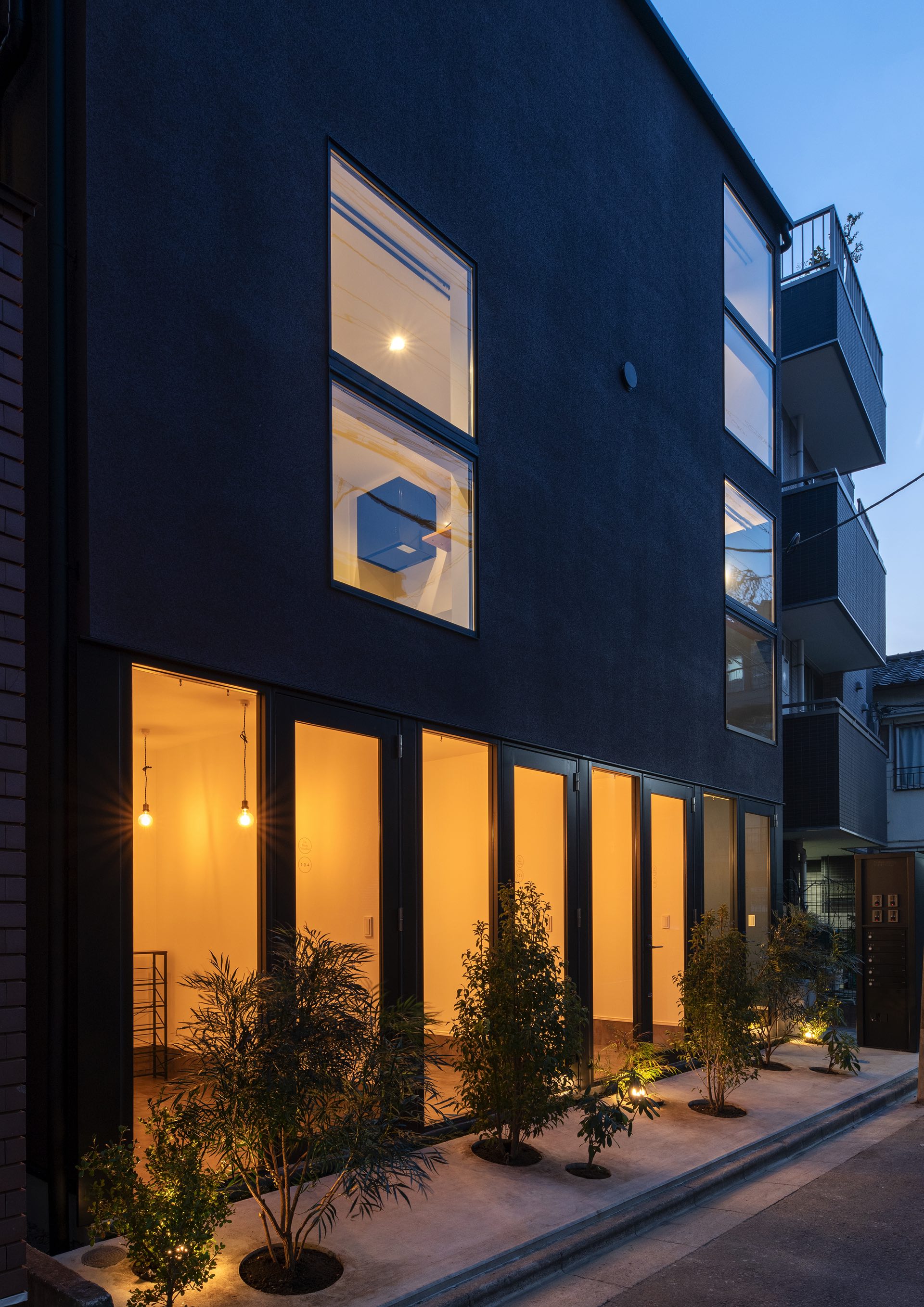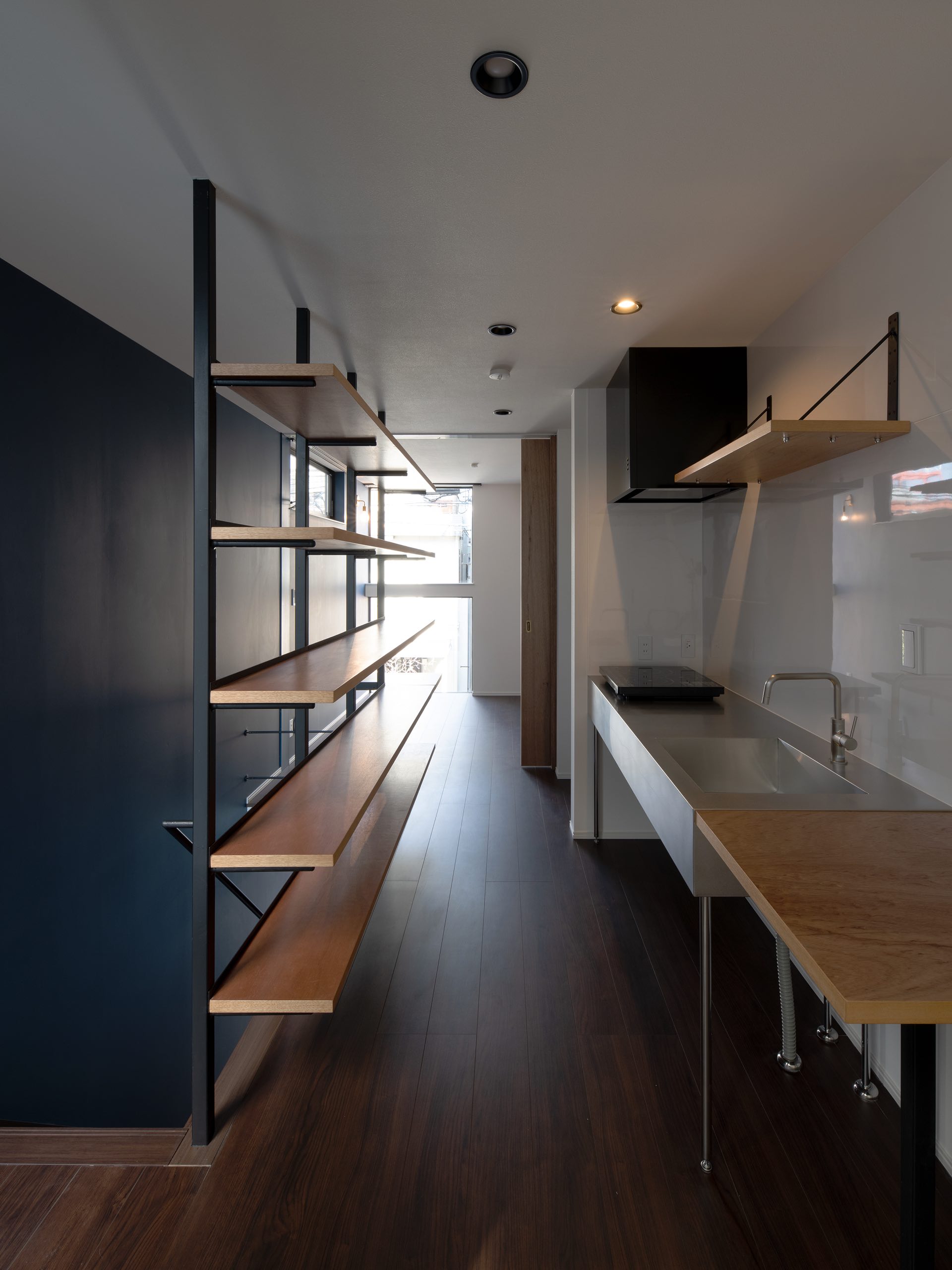 東尾久四丁目の集合住宅 準工業地域 構造:木造 敷地面積:102.30㎡ 延床面積:181.81㎡ 住戸数 :4戸 ファサード面は玄関ドアとFIXの水平連続窓を設けるアイコニックな外観。屋根勾配を利用したハイサイドライトから南の採光を取り入れた明るいLDK。天井面の内装は木羽目板を使用した高級仕様、コストバランスとコントラストを利かせたデザイン。