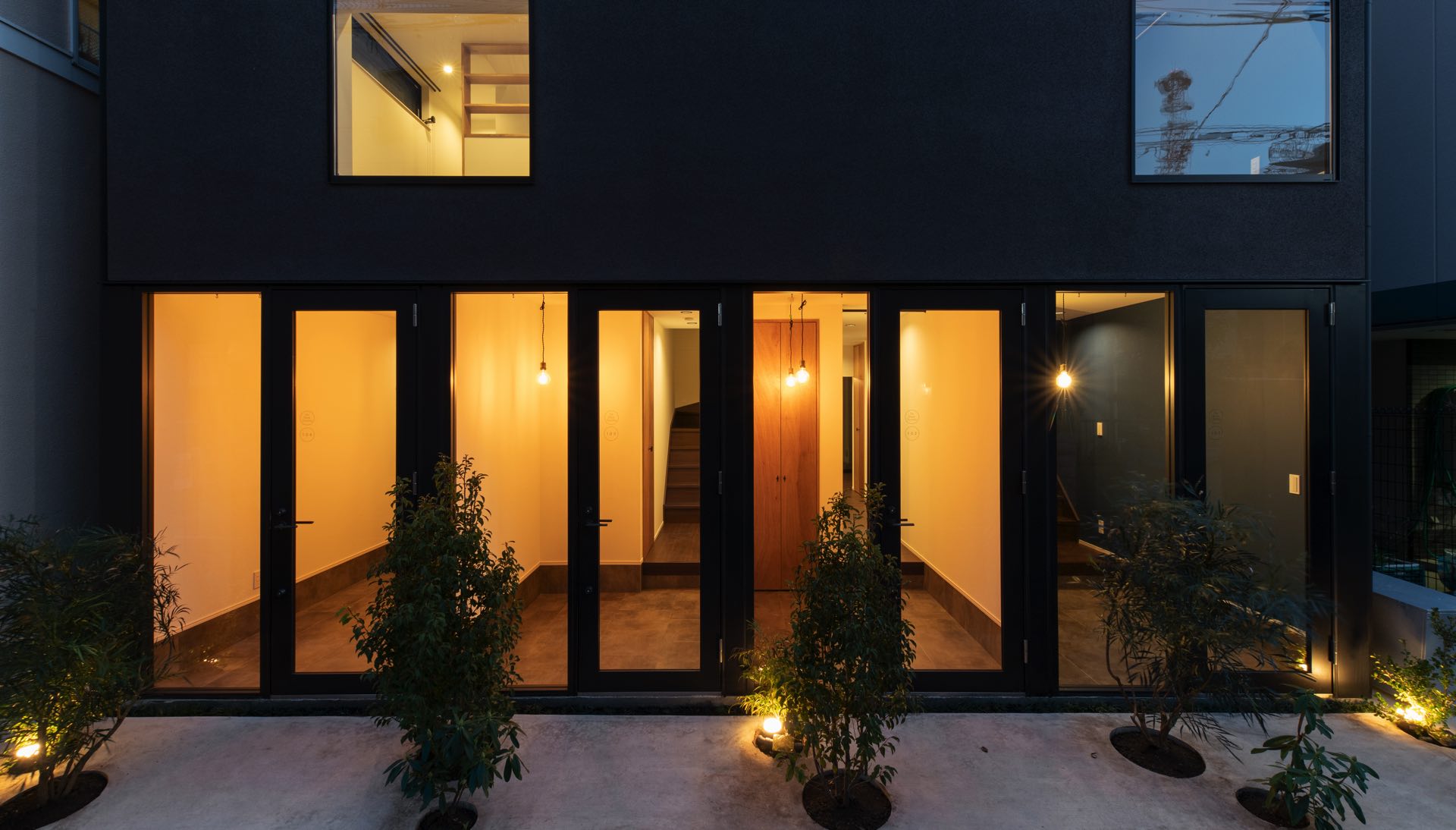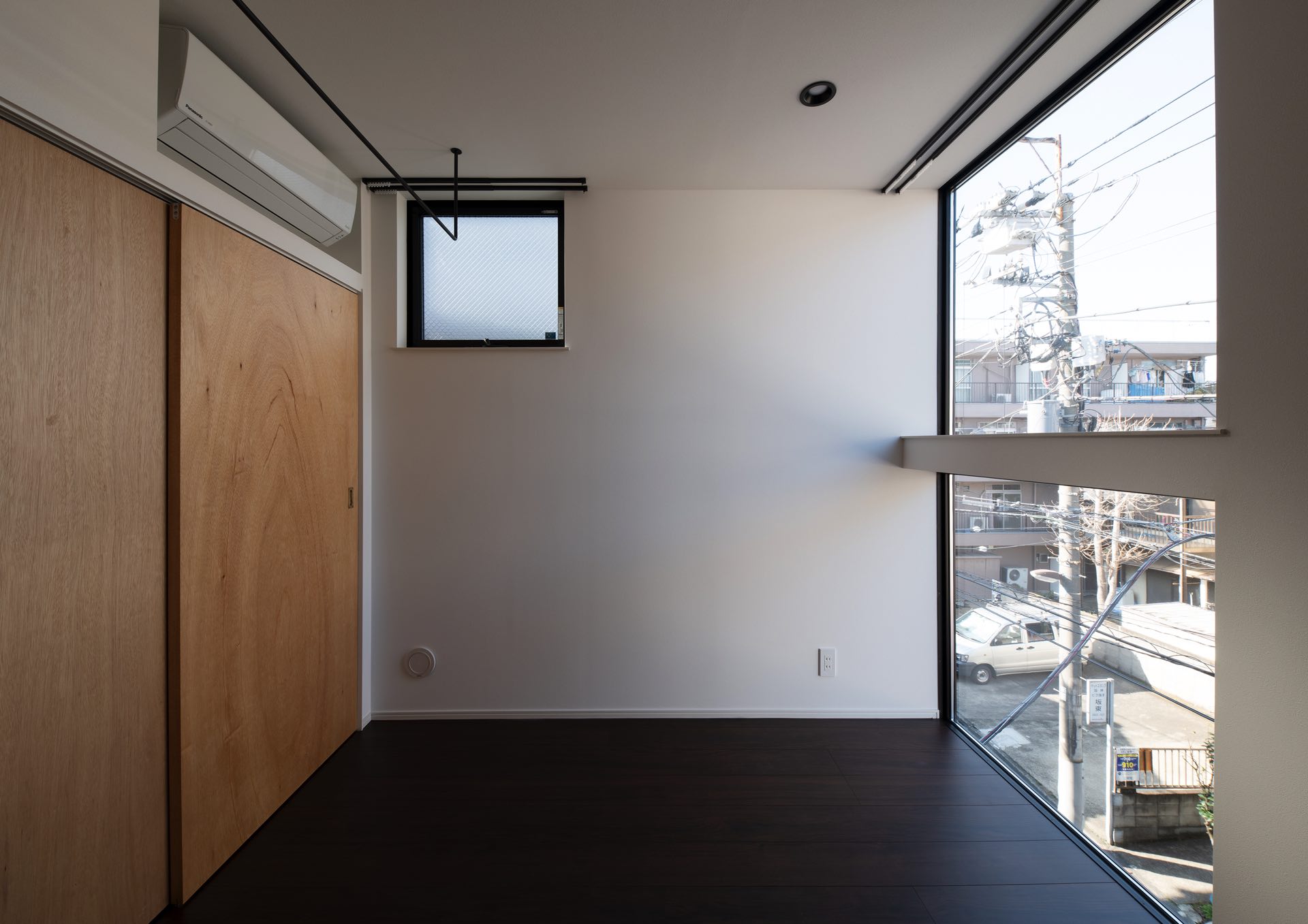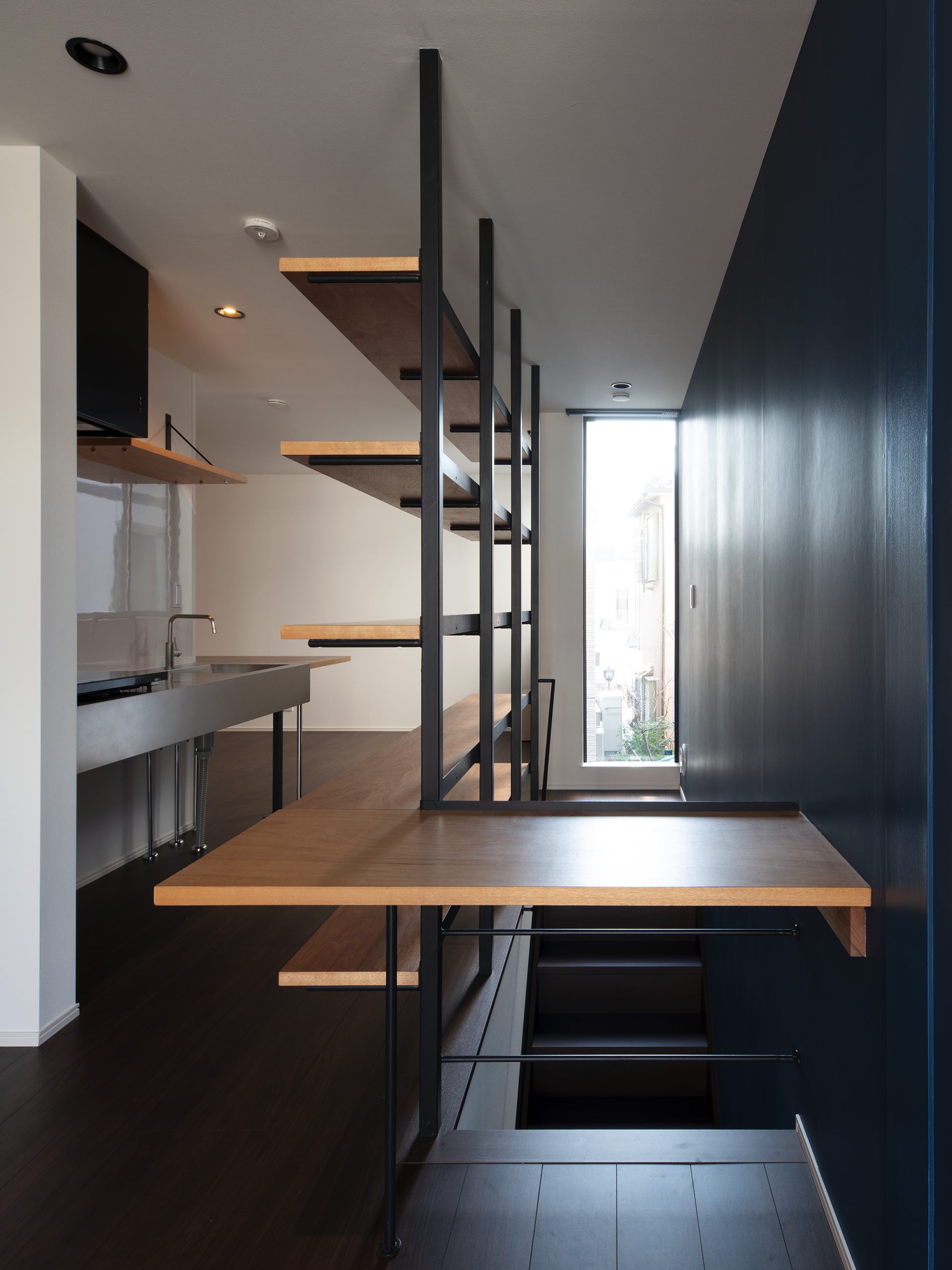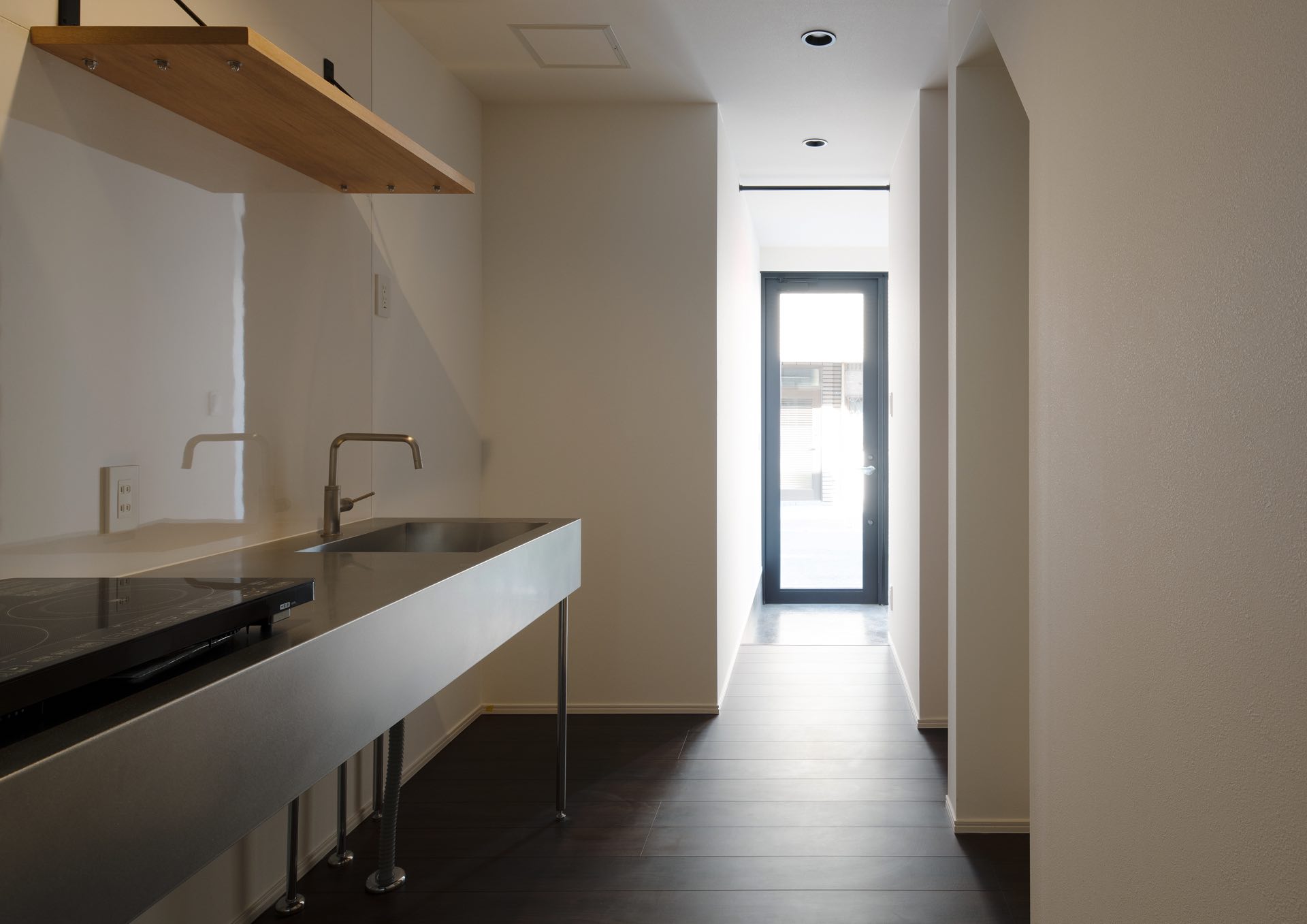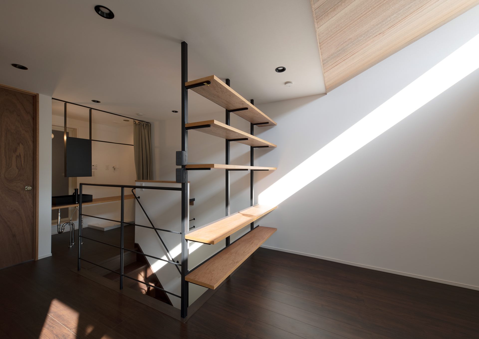 東尾久四丁目の集合住宅 準工業地域 構造:木造 敷地面積:102.30㎡ 延床面積:181.81㎡ 住戸数 :4戸 ファサード面は玄関ドアとFIXの水平連続窓を設けるアイコニックな外観。屋根勾配を利用したハイサイドライトから南の採光を取り入れた明るいLDK。天井面の内装は木羽目板を使用した高級仕様、コストバランスとコントラストを利かせたデザイン。