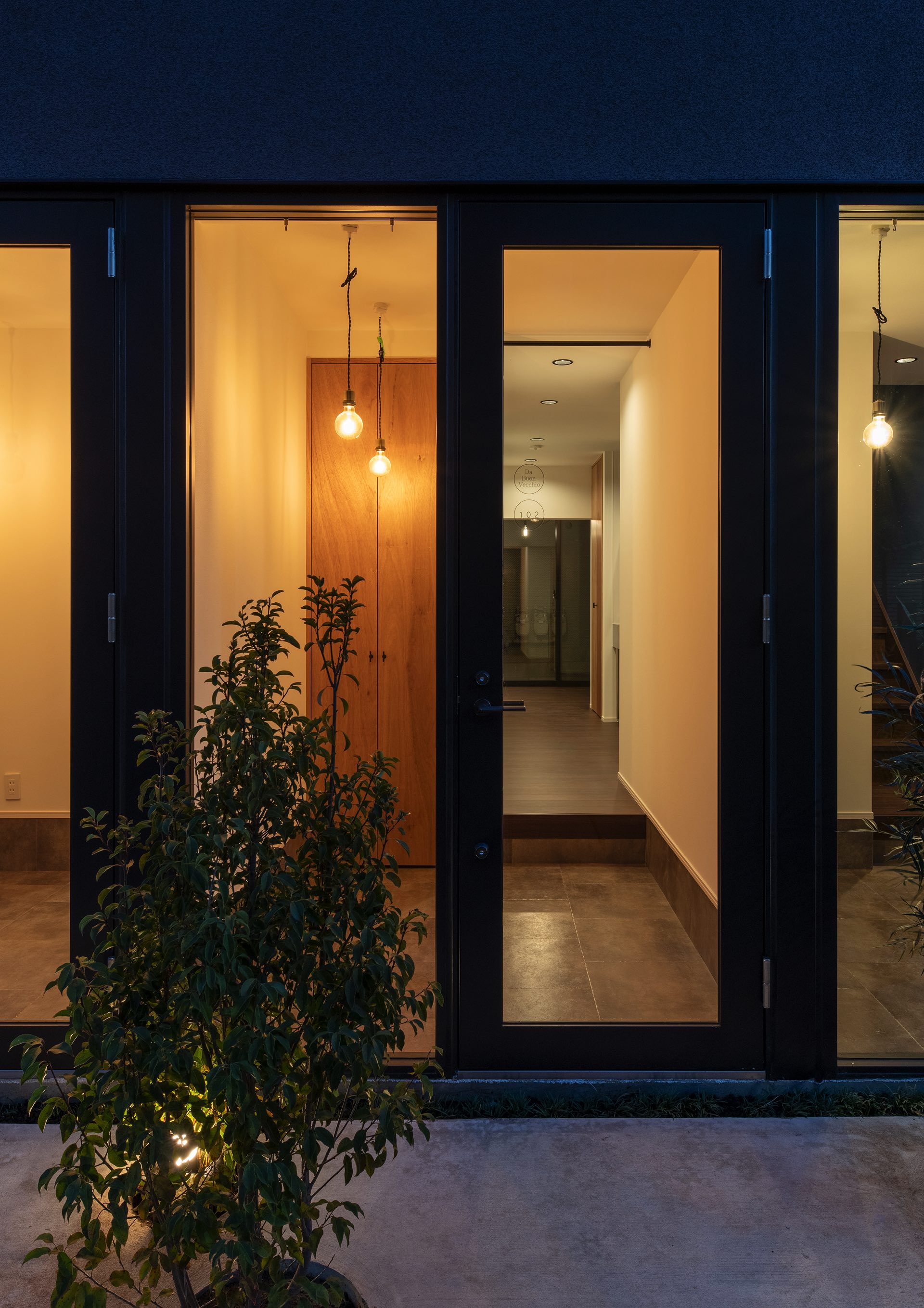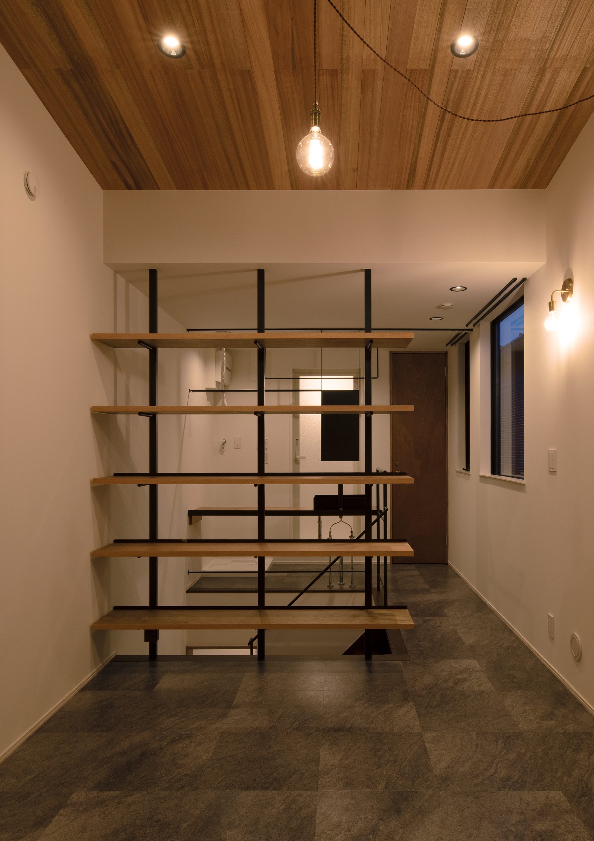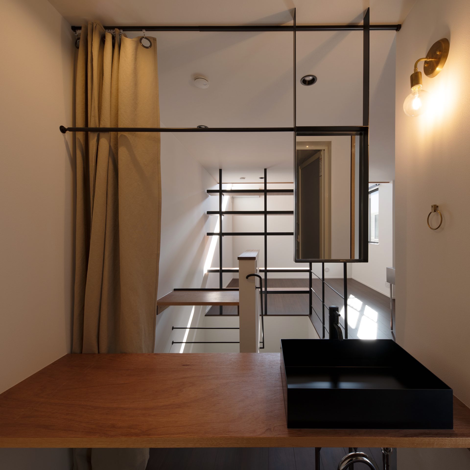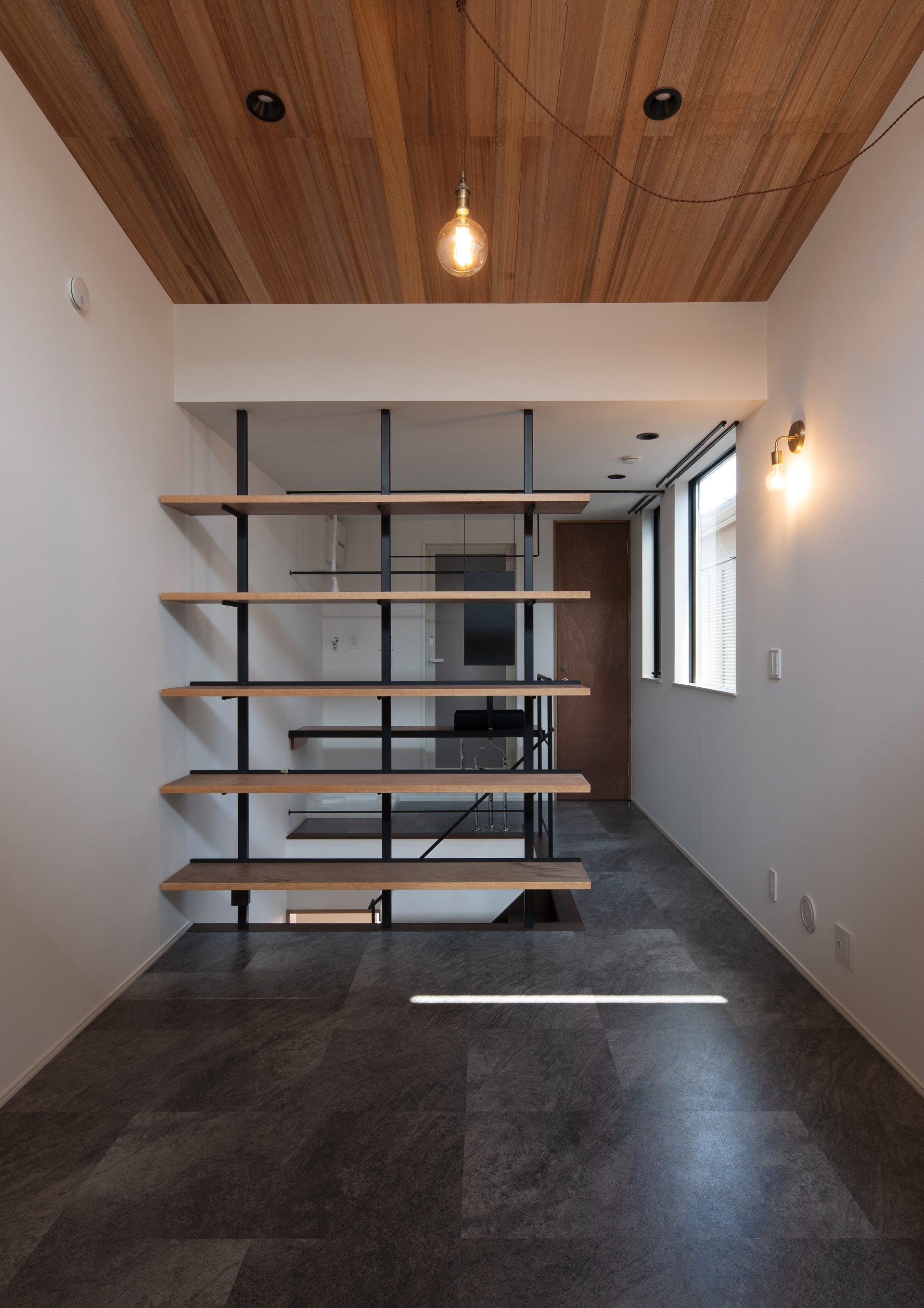 東尾久四丁目の集合住宅 準工業地域 構造:木造 敷地面積:102.30㎡ 延床面積:181.81㎡ 住戸数 :4戸 ファサード面は玄関ドアとFIXの水平連続窓を設けるアイコニックな外観。屋根勾配を利用したハイサイドライトから南の採光を取り入れた明るいLDK。天井面の内装は木羽目板を使用した高級仕様、コストバランスとコントラストを利かせたデザイン。